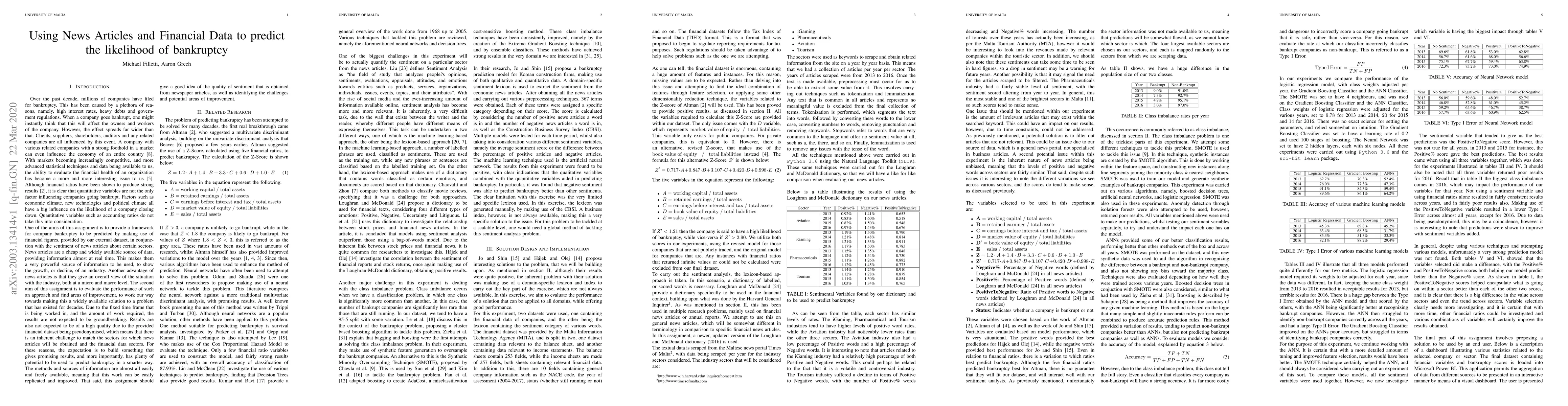 Over the past decade, millions of companies have filed for bankruptcy. This has been caused by a plethora of reasons, namely, high interest rates, heavy debts and government regulations. The effect of a company going bankrupt can be devastating, hurting not only workers and shareholders, but also clients, suppliers and any related external companies. One of the aims of this paper is to provide a framework for company bankruptcy to be predicted by making use of financial figures, provided by our external dataset, in conjunction with the sentiment of news articles about certain sectors. News articles are used to attempt to quantify the sentiment on a company and its sector from an external perspective, rather than simply using internal figures. This work builds on previous studies carried out by multiple researchers, to bring us closer to lessening the impact of such events.