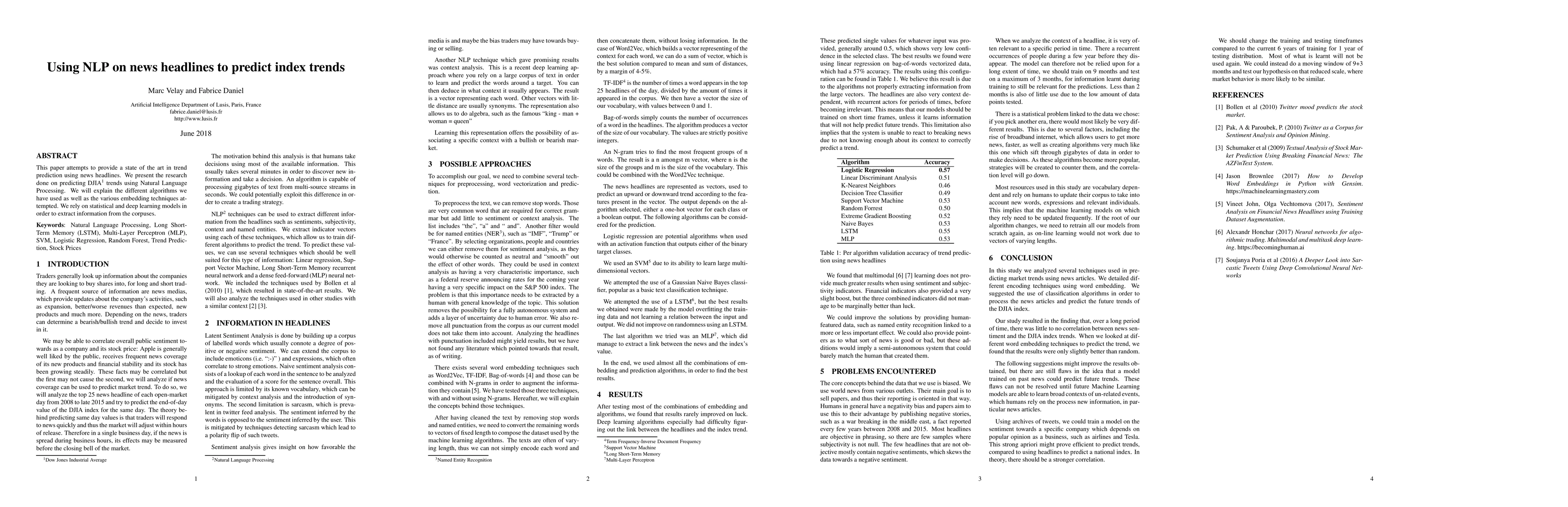 This paper attempts to provide a state of the art in trend prediction using news headlines. We present the research done on predicting DJIA trends using Natural Language Processing. We will explain the different algorithms we have used as well as the various embedding techniques attempted. We rely on statistical and deep learning models in order to extract information from the corpuses.