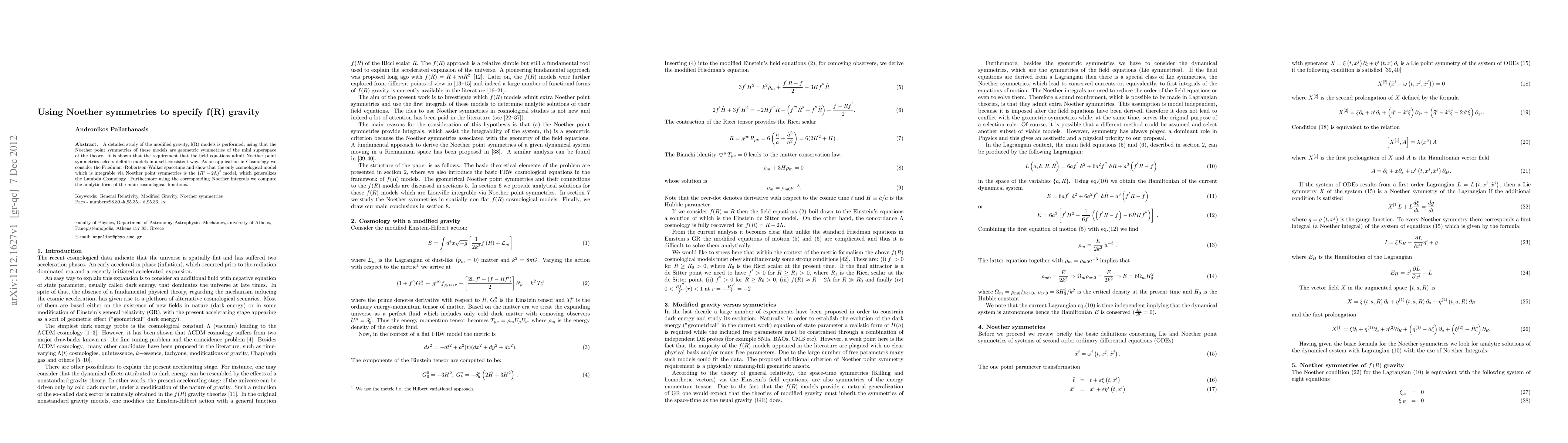 A detailed study of the modified gravity, f(R) models is performed, using that the Noether point symmetries of these models are geometric symmetries of the mini superspace of the theory. It is shown that the requirement that the field equations admit Noether point symmetries selects definite models in a self-consistent way. As an application in Cosmology we consider the Friedman -Robertson-Walker spacetime and show that the only cosmological model which is integrable via Noether point symmetries is the $(R^{b}-2\Lambda) ^{c}$ model, which generalizes the Lambda Cosmology. Furthermore using the corresponding Noether integrals we compute the analytic form of the main cosmological functions.
