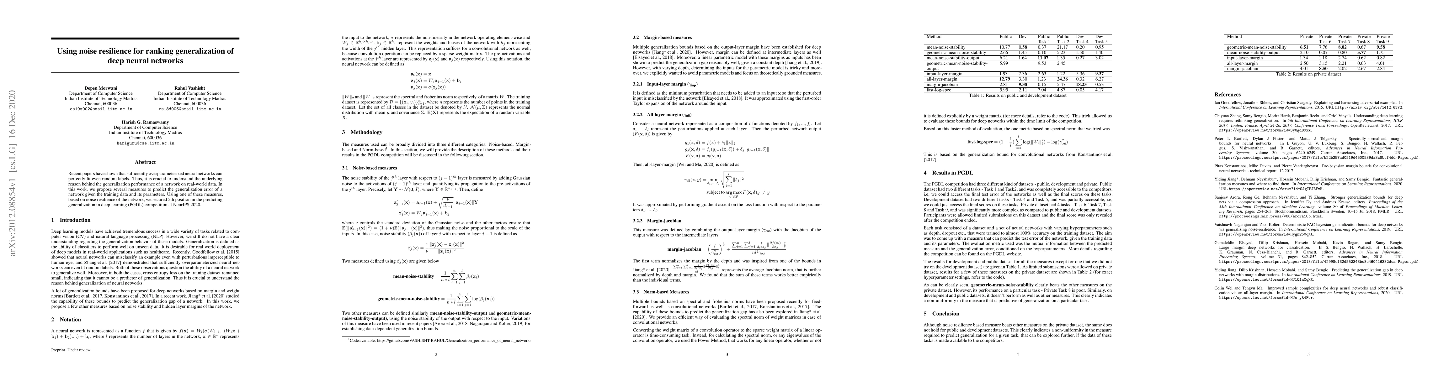 This paper proposes measures to predict the generalization error of deep neural networks, focusing on noise resilience. The authors secured 5th place in the NeurIPS 2020 PGDL competition using a noise resilience-based measure.