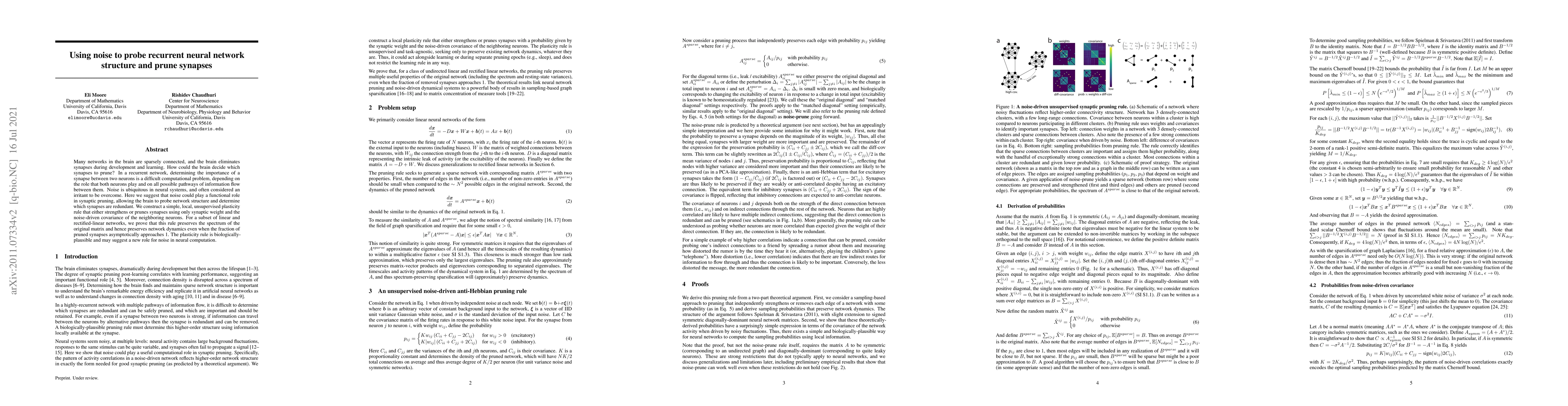 Many networks in the brain are sparsely connected, and the brain eliminates synapses during development and learning. How could the brain decide which synapses to prune? In a recurrent network, determining the importance of a synapse between two neurons is a difficult computational problem, depending on the role that both neurons play and on all possible pathways of information flow between them. Noise is ubiquitous in neural systems, and often considered an irritant to be overcome. Here we suggest that noise could play a functional role in synaptic pruning, allowing the brain to probe network structure and determine which synapses are redundant. We construct a simple, local, unsupervised plasticity rule that either strengthens or prunes synapses using only synaptic weight and the noise-driven covariance of the neighboring neurons. For a subset of linear and rectified-linear networks, we prove that this rule preserves the spectrum of the original matrix and hence preserves network dynamics even when the fraction of pruned synapses asymptotically approaches 1. The plasticity rule is biologically-plausible and may suggest a new role for noise in neural computation.