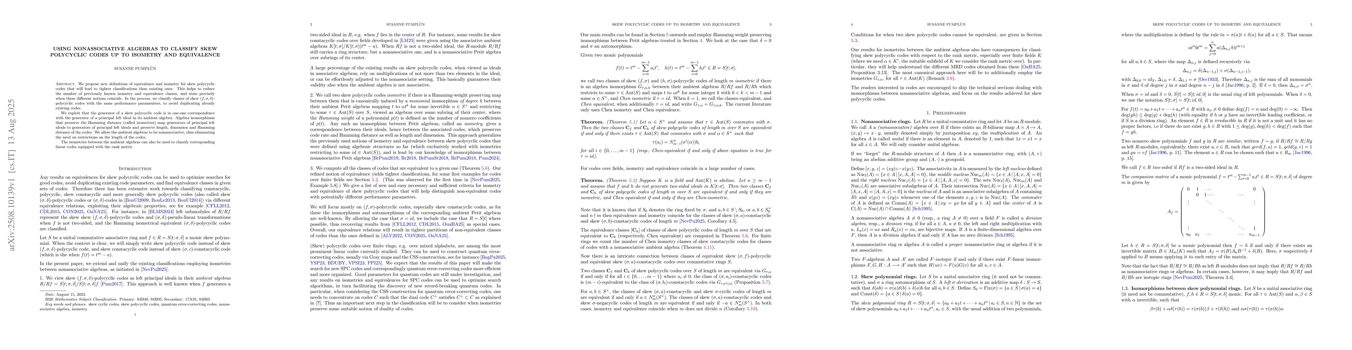 We propose new definitions of equivalence and isometry for skew polycyclic codes that will lead to tighter classifications than existing ones. This helps to reduce the number of previously known isometry and equivalence classes, and state precisely when these different notions coincide. In the process, we classify classes of skew $(f,\sigma,\delta)$-polycyclic codes with the same performance parameters, to avoid duplicating already existing codes. We exploit that the generator of a skew polycyclic code is in one-one correspondence with the generator of a principal left ideal in its ambient algebra. Algebra isomorphisms that preserve the Hamming distance (called isometries) map generators of principal left ideals to generators of principal left ideals and preserve length, dimension and Hamming distance of the codes. We allow the ambient algebras to be nonassociative, thus eliminating the need on restrictions on the length of the codes. The isometries between the ambient algebras can also be used to classify corresponding linear codes equipped with the rank metric.
