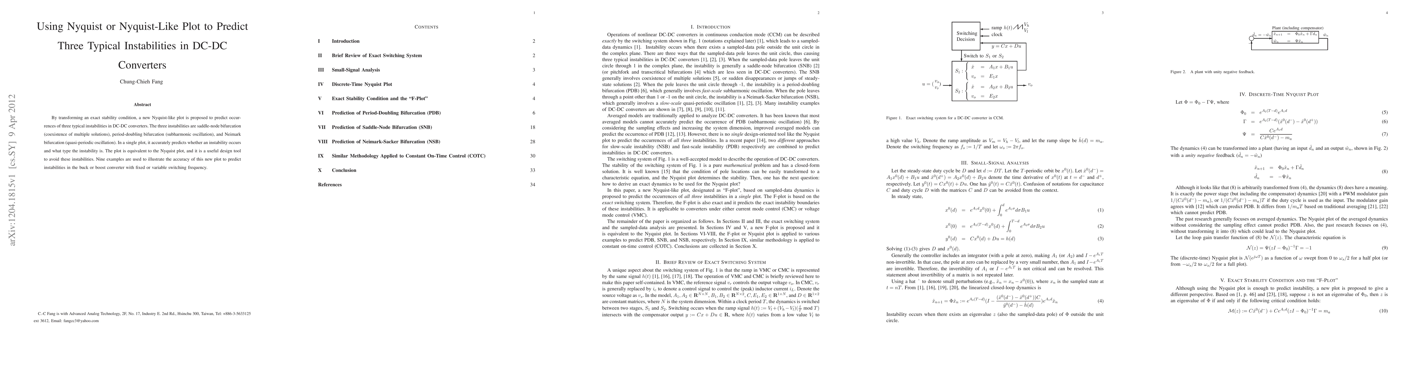By transforming an exact stability condition, a new Nyquist-like plot is proposed to predict occurrences of three typical instabilities in DC-DC converters. The three instabilities are saddle-node bifurcation (coexistence of multiple solutions), period-doubling bifurcation (subharmonic oscillation), and Neimark bifurcation (quasi-periodic oscillation). In a single plot, it accurately predicts whether an instability occurs and what type the instability is. The plot is equivalent to the Nyquist plot, and it is a useful design tool to avoid these instabilities. Nine examples are used to illustrate the accuracy of this new plot to predict instabilities in the buck or boost converter with fixed or variable switching frequency.
