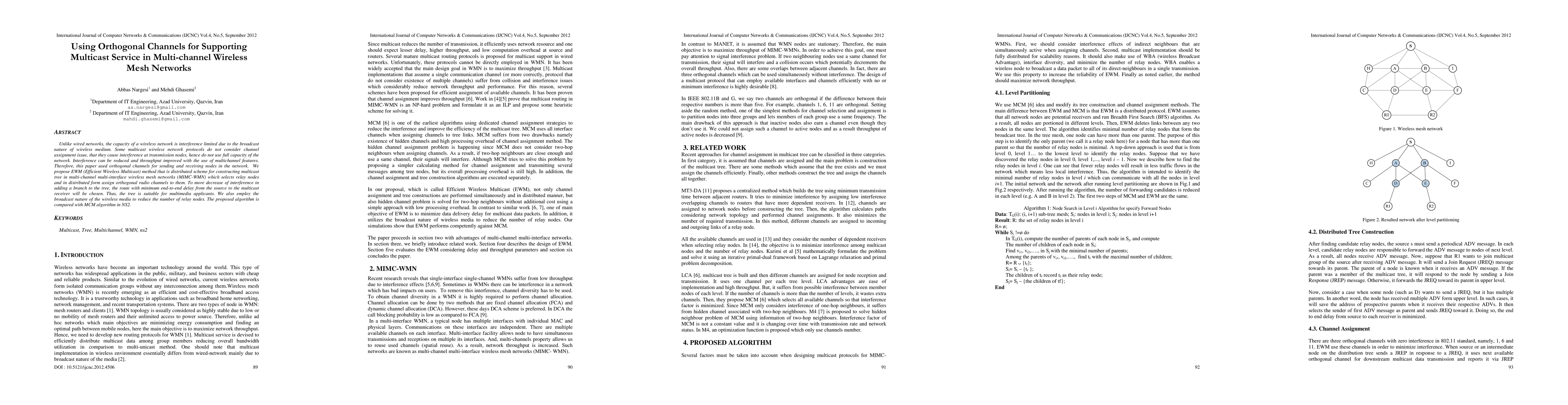 This paper proposes EWM, a distributed method for constructing multicast trees in multichannel wireless mesh networks, utilizing orthogonal channels to minimize interference and maximize throughput. The algorithm selects relay nodes and assigns channels to optimize end-to-end delay, enhancing performance for multimedia applications, and is compared with the MCM algorithm in NS2 simulations.