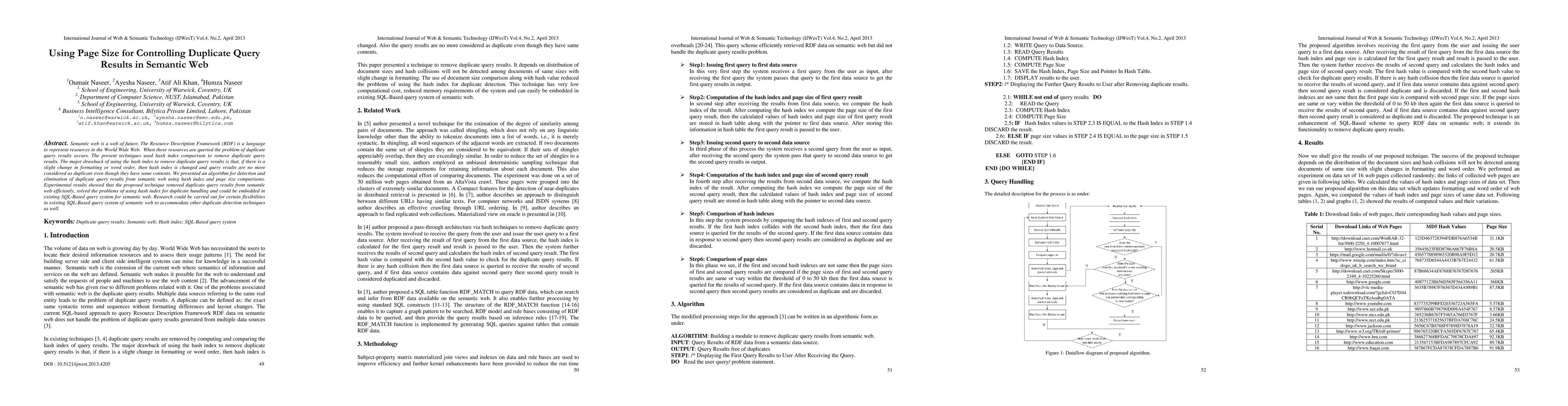 The research presents an algorithm for detecting and eliminating duplicate query results from the Semantic Web using hash index and page size comparisons. It involves steps such as issuing queries to data sources, computing hash indices and page sizes, storing these values in a hash table, and comparing them to identify duplicates.