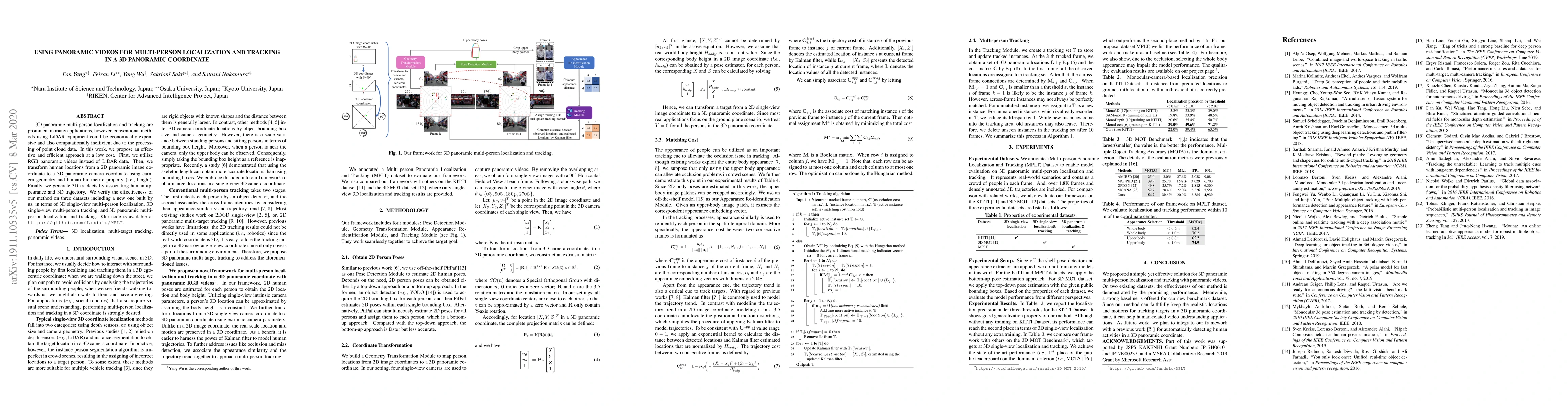 This paper proposes a cost-effective method for multi-person localization and tracking using panoramic videos captured by four normal cameras, transforming 2D coordinates to 3D using camera geometry and human biometrics, and generating 3D tracklets. The approach is validated on three datasets, demonstrating its effectiveness in 3D localization and tracking.