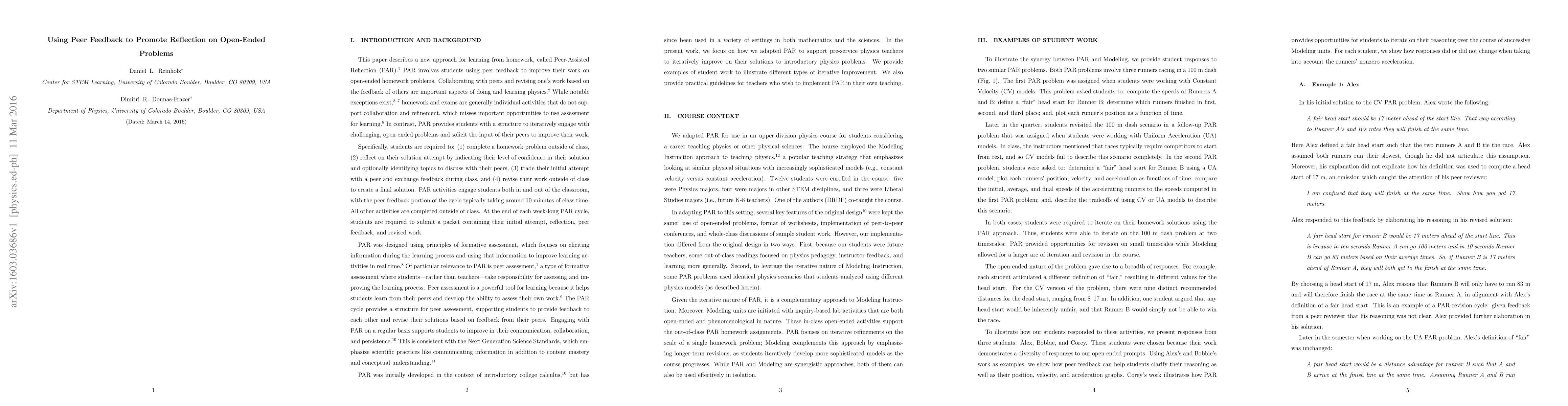 This paper introduces Peer-Assisted Reflection (PAR), a method for students to use peer feedback to enhance their work on open-ended homework problems, fostering collaboration and iterative improvement in learning physics. Unlike traditional individual assessments, PAR leverages peer input to create opportunities for assessment for learning.