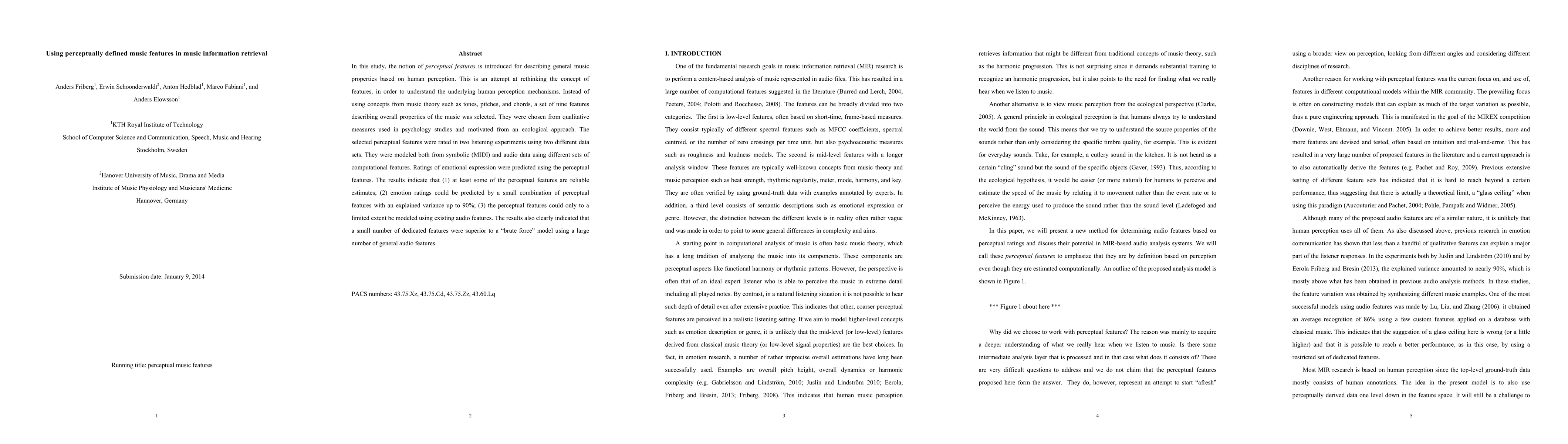 Researchers found that a set of 9 perceptual music features can reliably estimate emotional expression in music, with up to 90% explained variance, and that these features outperform a 'brute force' model using general audio features.