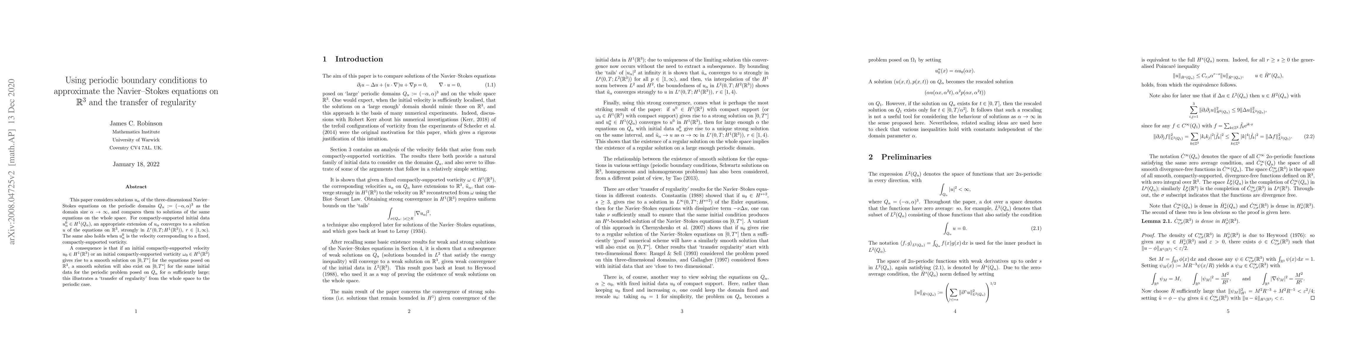 This paper considers solutions $u_\alpha$ of the three-dimensional Navier--Stokes equations on the periodic domains $Q_\alpha:=(-\alpha,\alpha)^3$ as the domain size $\alpha\to\infty$, and compares them to solutions of the same equations on the whole space. For compactly-supported initial data $u_\alpha^0\in H^1(Q_\alpha)$, an appropriate extension of $u_\alpha$ converges to a solution $u$ of the equations on ${\mathbb R}^3$, strongly in $L^r(0,T;H^1({\mathbb R}^3))$, $r\in[1,\infty)$. The same also holds when $u_\alpha^0$ is the velocity corresponding to a fixed, compactly-supported vorticity. A consequence is that if an initial compactly-supported velocity $u_0\in H^1({\mathbb R}^3)$ or an initial compactly-supported vorticity $\omega_0\in H^1({\mathbb R}^3)$ gives rise to a smooth solution on $[0,T^*]$ for the equations posed on ${\mathbb R}^3$, a smooth solution will also exist on $[0,T^*]$ for the same initial data for the periodic problem posed on ${Q_\alpha}$ for $\alpha$ sufficiently large; this illustrates a `transfer of regularity' from the whole space to the periodic case.