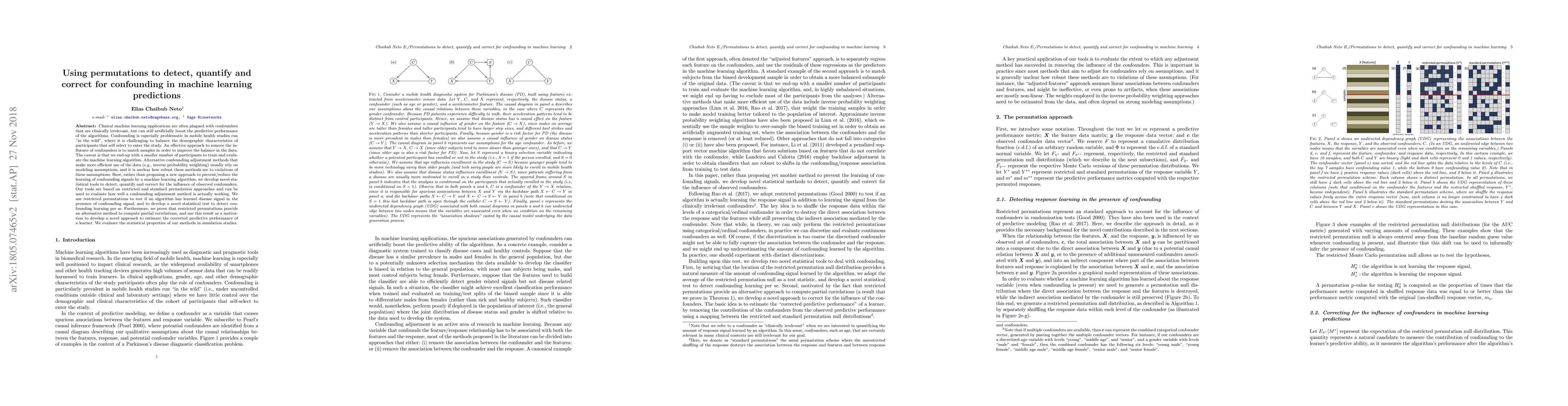 Clinical machine learning applications are often plagued with confounders that are clinically irrelevant, but can still artificially boost the predictive performance of the algorithms. Confounding is especially problematic in mobile health studies run "in the wild", where it is challenging to balance the demographic characteristics of participants that self select to enter the study. An effective approach to remove the influence of confounders is to match samples in order to improve the balance in the data. The caveat is that we end-up with a smaller number of participants to train and evaluate the machine learning algorithm. Alternative confounding adjustment methods that make more efficient use of the data (e.g., inverse probability weighting) usually rely on modeling assumptions, and it is unclear how robust these methods are to violations of these assumptions. Here, rather than proposing a new approach to prevent/reduce the learning of confounding signals by a machine learning algorithm, we develop novel statistical tools to detect, quantify and correct for the influence of observed confounders. Our tools are based on restricted and standard permutation approaches and can be used to evaluate how well a confounding adjustment method is actually working. We use restricted permutations to test if an algorithm has learned disease signal in the presence of confounding signal, and to develop a novel statistical test to detect confounding learning per se. Furthermore, we prove that restricted permutations provide an alternative method to compute partial correlations, and use this result as a motivation to develop a novel approach to estimate the corrected predictive performance of a learner. We evaluate the statistical properties of our methods in simulation studies.