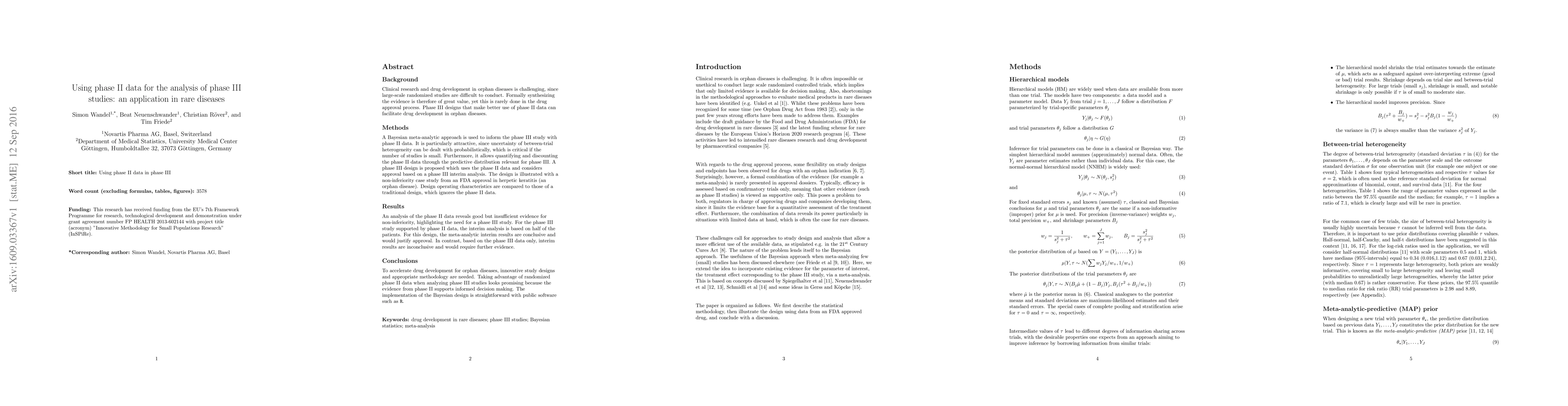 Clinical research and drug development in orphan diseases is challenging, since large-scale randomized studies are difficult to conduct. Formally synthesizing the evidence is therefore of great value, yet this is rarely done in the drug approval process. Phase III designs that make better use of phase II data can facilitate drug development in orphan diseases. A Bayesian meta-analytic approach is used to inform the phase III study with phase II data. It is particularly attractive, since uncertainty of between-trial heterogeneity can be dealt with probabilistically, which is critical if the number of studies is small. Furthermore, it allows quantifying and discounting the phase II data through the predictive distribution relevant for phase III. A phase III design is proposed which uses the phase II data and considers approval based on a phase III interim analysis. The design is illustrated with a non-inferiority case study from an FDA approval in herpetic keratitis (an orphan disease). Design operating characteristics are compared to those of a traditional design, which ignores the phase II data. An analysis of the phase II data reveals good but insufficient evidence for non-inferiority, highlighting the need for a phase III study. For the phase III study supported by phase II data, the interim analysis is based on half of the patients. For this design, the meta-analytic interim results are conclusive and would justify approval. In contrast, based on the phase III data only, interim results are inconclusive and would require further evidence. To accelerate drug development for orphan diseases, innovative study designs and appropriate methodology are needed. Taking advantage of randomized phase II data when analyzing phase III studies looks promising because the evidence from phase II supports informed decision making. The implementation of the Bayesian design is straightforward.