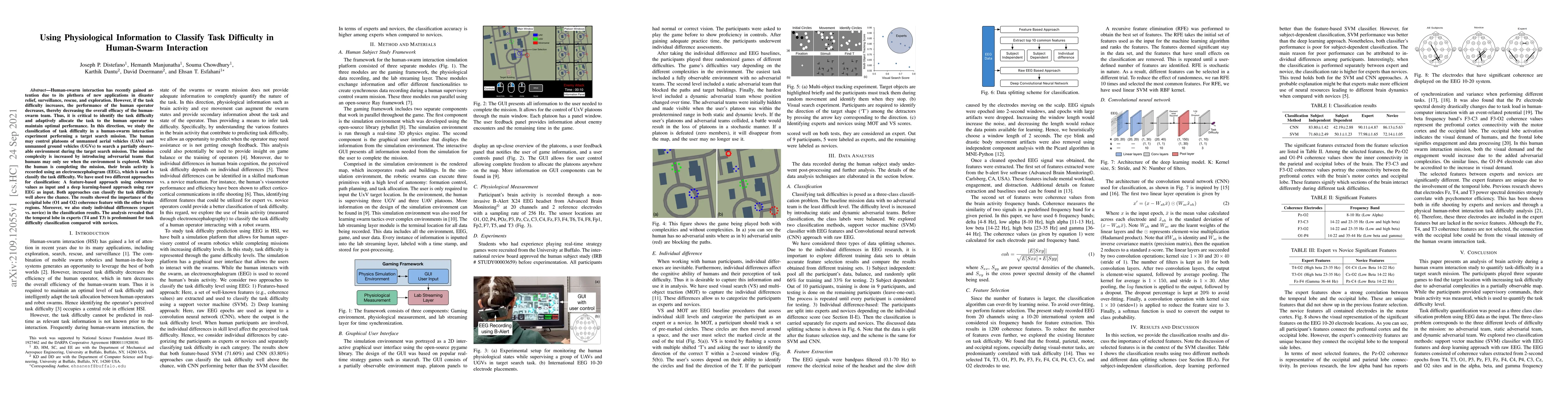 This paper explores classifying task difficulty in human-swarm interactions using EEG data, focusing on a target search mission involving UAVs and UGVs. Two classification methods—feature-based and deep learning—showed effective task difficulty identification, highlighting the importance of occipital lobe coherence and differences in temporal lobe activity between experts and novices.