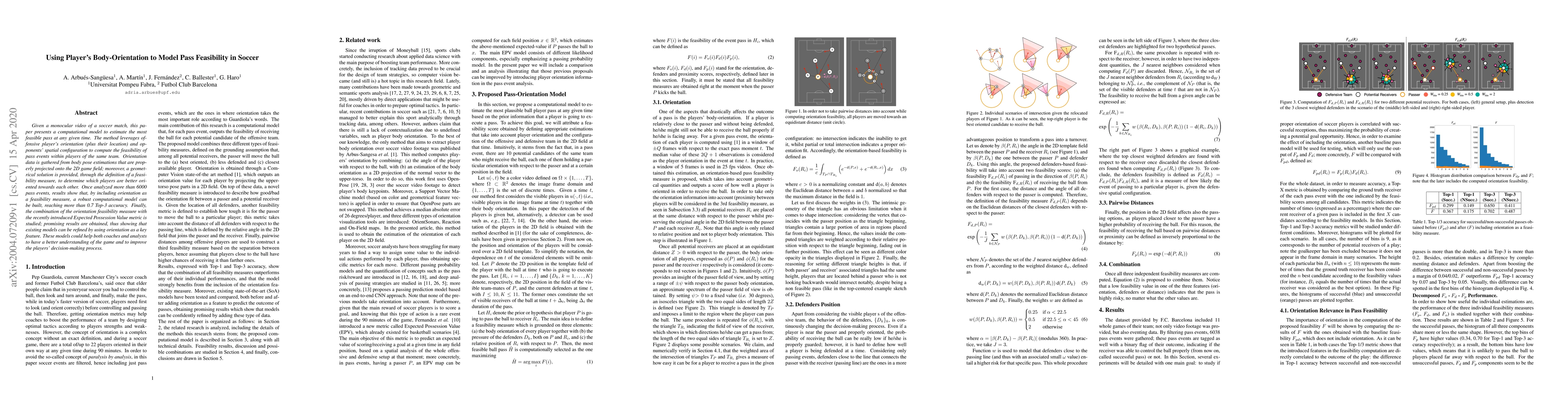 A computational model estimates the most feasible pass in soccer based on player orientation and opponent spatial configuration, achieving over 0.7 Top-3 accuracy.