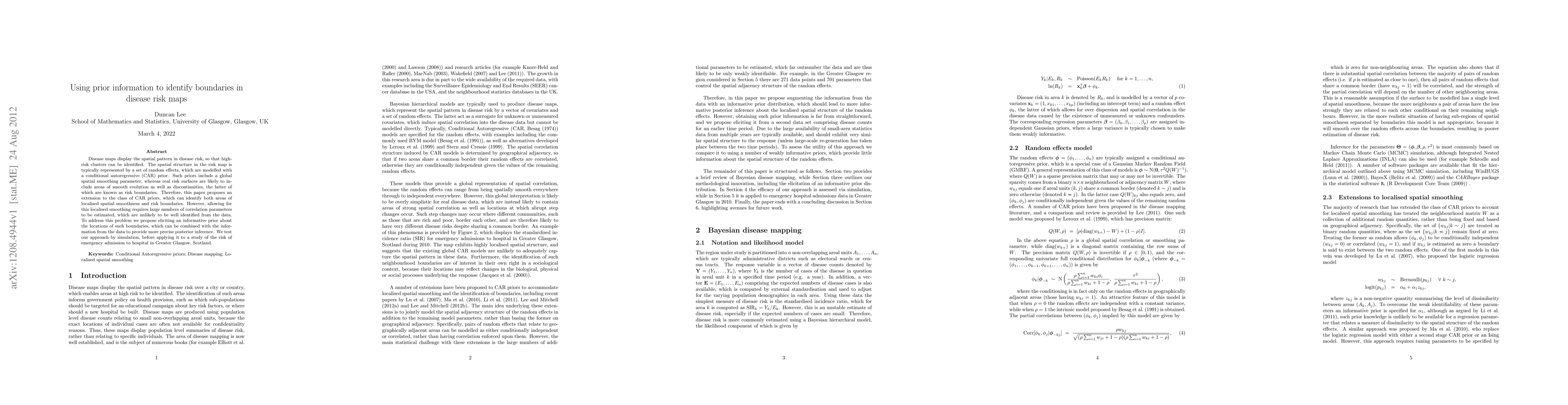 Disease maps display the spatial pattern in disease risk, so that high-risk clusters can be identified. The spatial structure in the risk map is typically represented by a set of random effects, which are modelled with a conditional autoregressive (CAR) prior. Such priors include a global spatial smoothing parameter, whereas real risk surfaces are likely to include areas of smooth evolution as well as discontinuities, the latter of which are known as risk boundaries. Therefore, this paper proposes an extension to the class of CAR priors, which can identify both areas of localised spatial smoothness and risk boundaries. However, allowing for this localised smoothing requires large numbers of correlation parameters to be estimated, which are unlikely to be well identified from the data. To address this problem we propose eliciting an informative prior about the locations of such boundaries, which can be combined with the information from the data to provide more precise posterior inference. We test our approach by simulation, before applying it to a study of the risk of emergency admission to hospital in Greater Glasgow, Scotland.