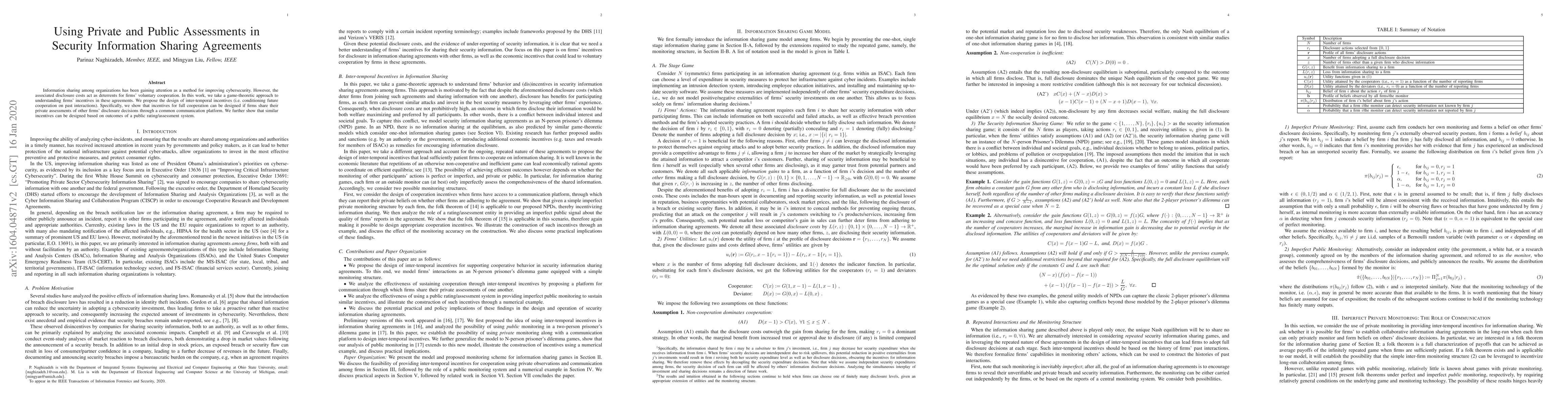 This paper explores how inter-temporal incentives can encourage cybersecurity information sharing among firms through private and public assessments. It demonstrates that firms can be incentivized to cooperate fully if they share private assessments and use public rating systems, addressing the deterrents of disclosure costs.