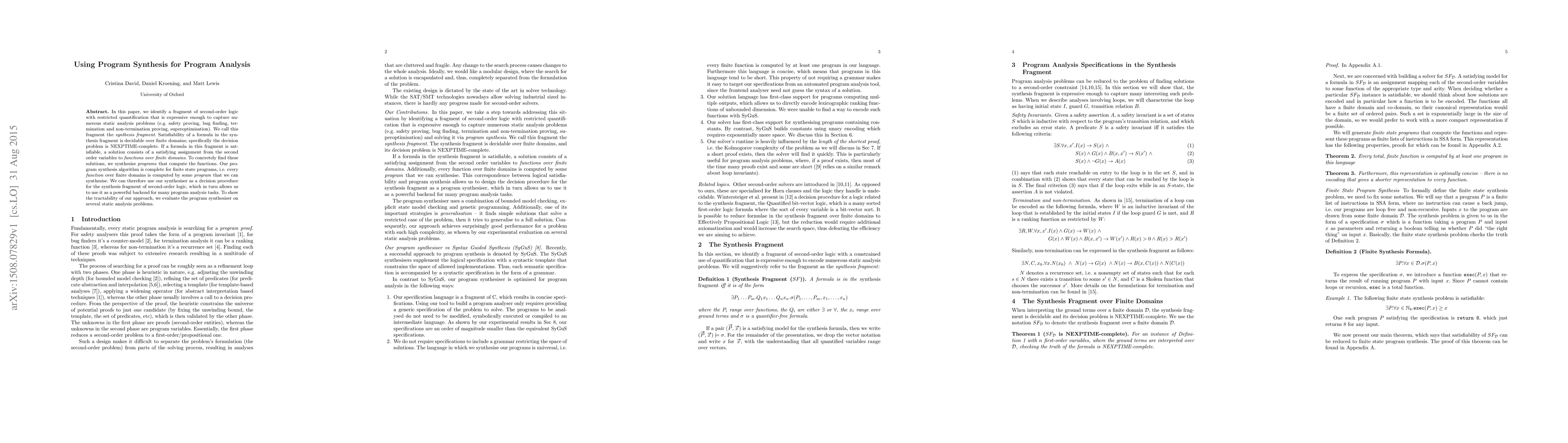 In this paper, we identify a fragment of second-order logic with restricted quantification that is expressive enough to capture numerous static analysis problems (e.g. safety proving, bug finding, termination and non-termination proving, superoptimisation). We call this fragment the {\it synthesis fragment}. Satisfiability of a formula in the synthesis fragment is decidable over finite domains; specifically the decision problem is NEXPTIME-complete. If a formula in this fragment is satisfiable, a solution consists of a satisfying assignment from the second order variables to \emph{functions over finite domains}. To concretely find these solutions, we synthesise \emph{programs} that compute the functions. Our program synthesis algorithm is complete for finite state programs, i.e. every \emph{function} over finite domains is computed by some \emph{program} that we can synthesise. We can therefore use our synthesiser as a decision procedure for the synthesis fragment of second-order logic, which in turn allows us to use it as a powerful backend for many program analysis tasks. To show the tractability of our approach, we evaluate the program synthesiser on several static analysis problems.