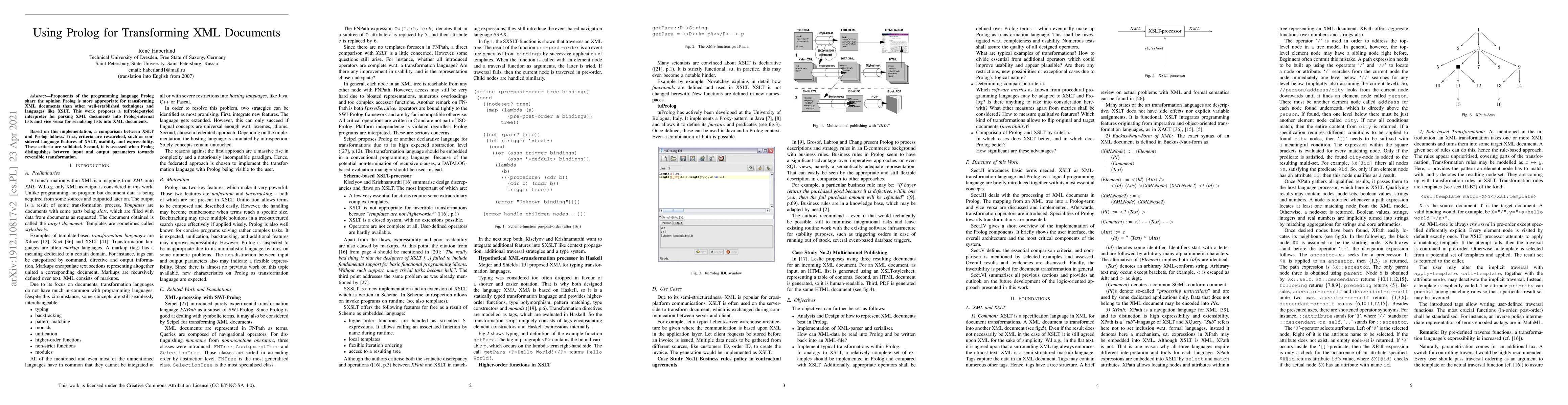 This paper proposes a tuProlog-styled interpreter for converting XML documents into Prolog-internal lists and vice versa, aiming to demonstrate Prolog's advantages over XSLT for XML transformations. It compares Prolog and XSLT based on language features, usability, and expressibility, concluding when Prolog excels in reversible transformations.
