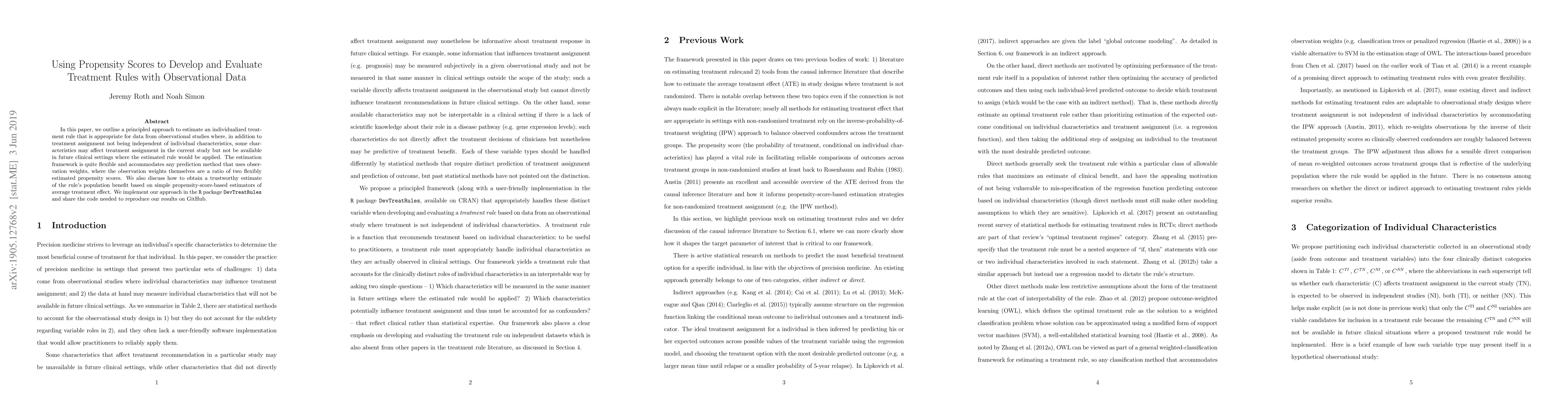 This paper proposes a method using propensity scores to develop and evaluate individualized treatment rules for observational data, accommodating scenarios where some influential characteristics may not be available in future clinical settings. The approach is flexible and implemented in the R package DevTreatRules, with code available on GitHub.
