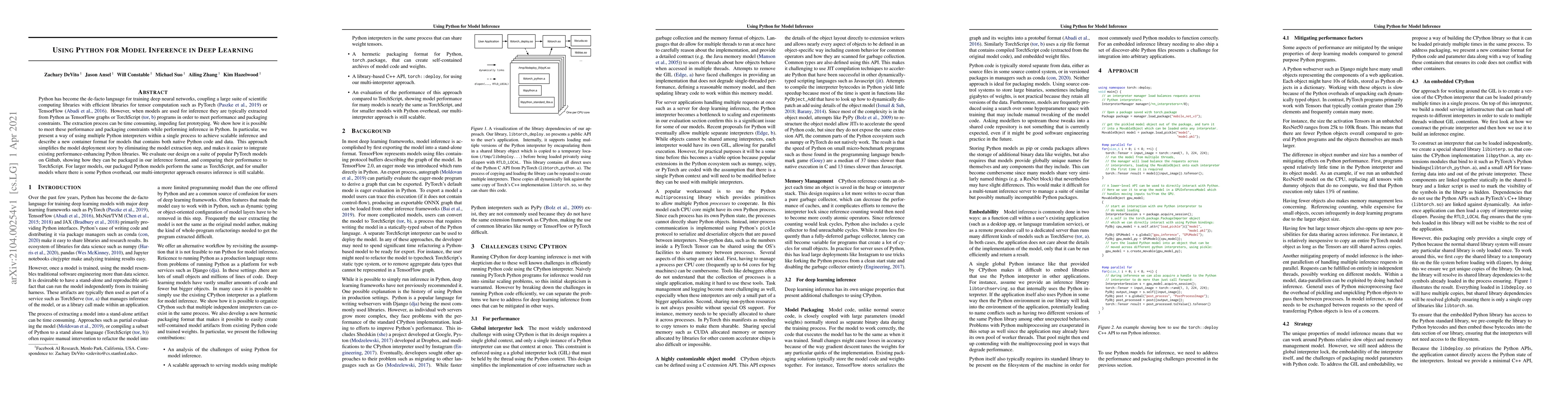 This paper proposes a method to perform scalable deep learning model inference directly within Python, eliminating the need for model extraction to TensorFlow graphs or TorchScript. It introduces a new container format that integrates native Python code and data, enabling performance and packaging constraints to be met without sacrificing the ease of prototyping.