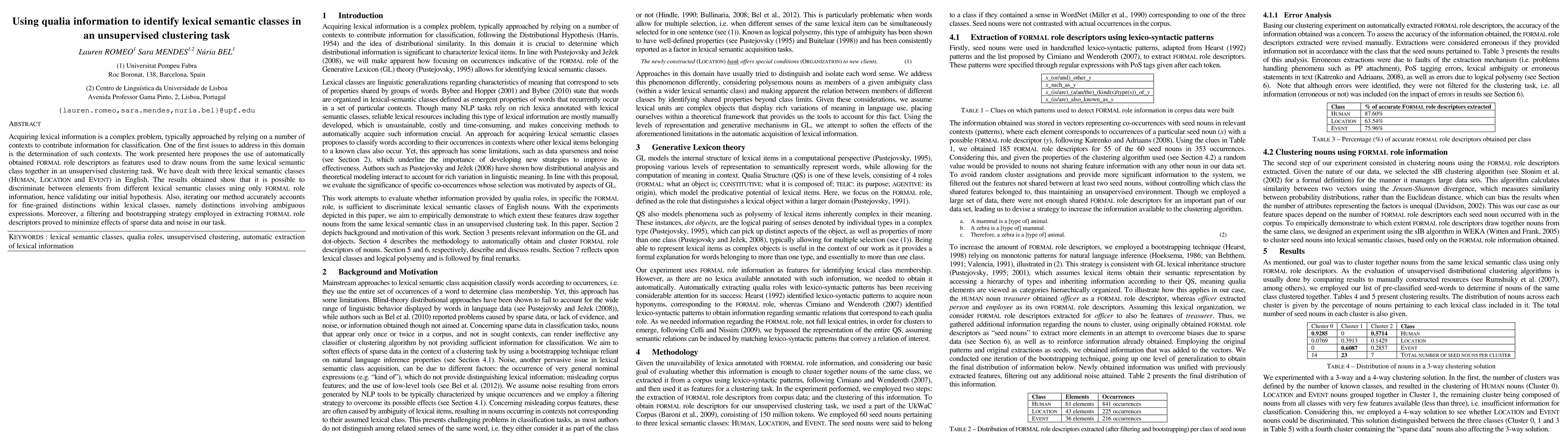 This paper proposes using FORMAL role descriptors to cluster nouns into lexical semantic classes (HUMAN, LOCATION, EVENT) in an unsupervised manner. The results demonstrate successful discrimination between classes and fine-grained distinctions, with a filtering and bootstrapping strategy mitigating sparse data and noise effects.