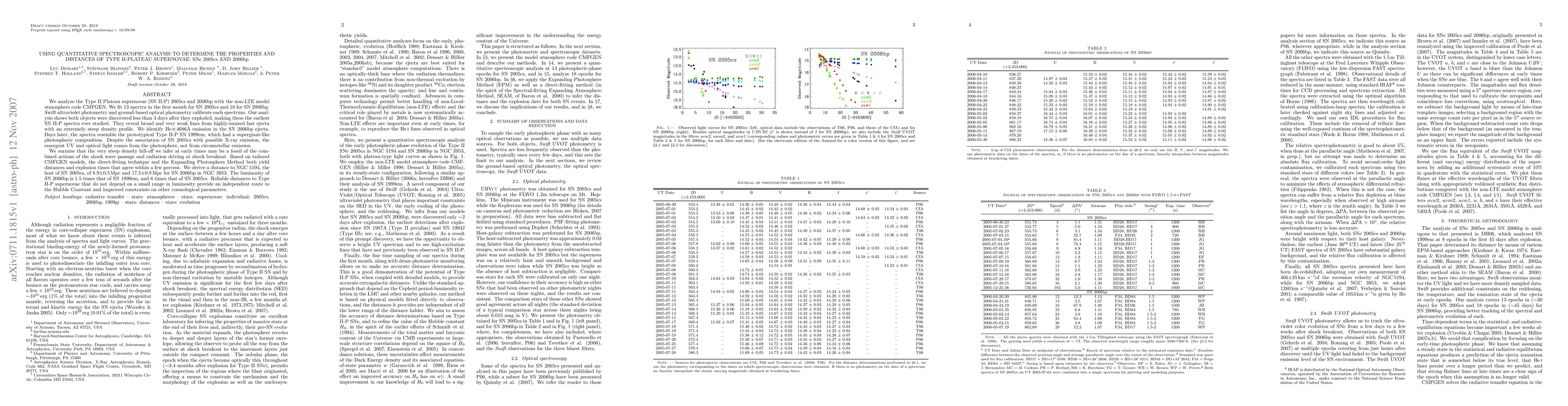 This paper uses quantitative spectroscopic analysis to determine properties and distances of Type II-Plateau supernovae SNe 2005cs and 2006bp, revealing early spectra and a steep density profile. The derived distances are 8.9±0.5 Mpc for SN 2005cs and 17.5±0.8 Mpc for SN 2006bp, providing an independent method for estimating the Hubble Constant.