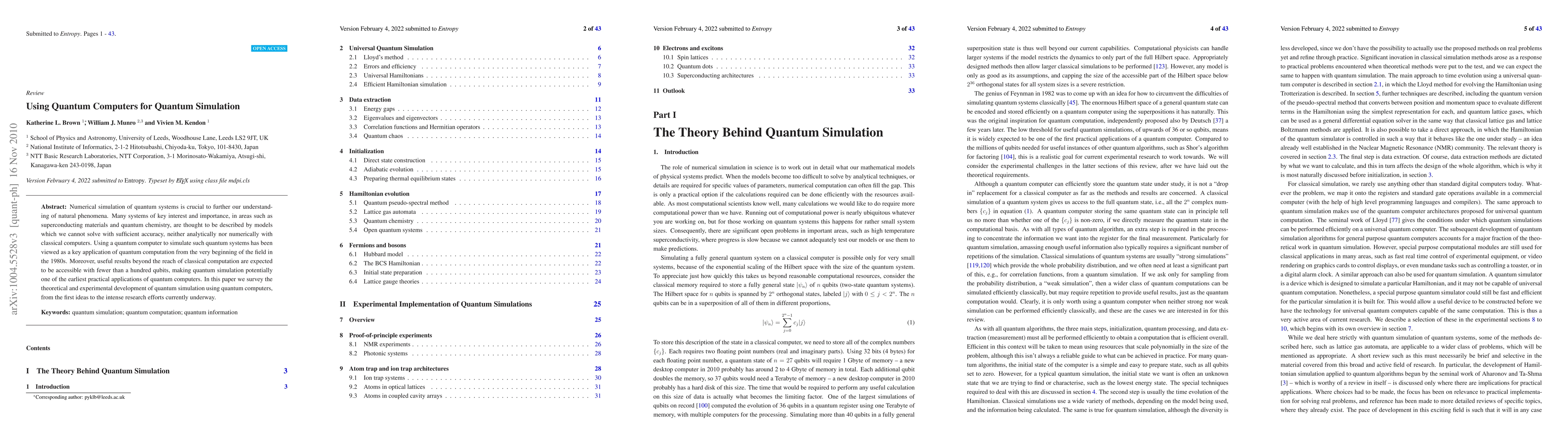 This paper surveys the theoretical and experimental advancements in quantum simulation using quantum computers, highlighting its potential as an early practical application due to expected results beyond classical computation's reach with fewer than a hundred qubits.