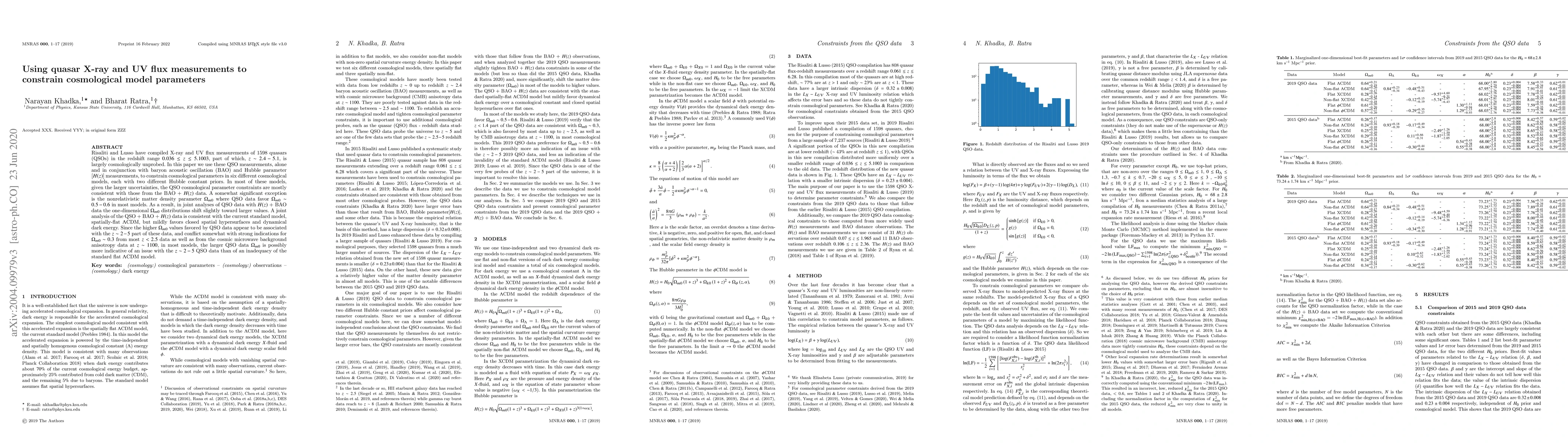 This paper uses X-ray and UV flux measurements from 1598 quasars to constrain cosmological model parameters, finding that the quasar data favors a non-relativistic matter density parameter $\Omega_{m0}$ in the range of 0.5-0.6. Joint analysis with Hubble parameter and baryon acoustic oscillation data supports the standard $\Lambda$CDM model but suggests slightly larger $\Omega_{m0}$ values.