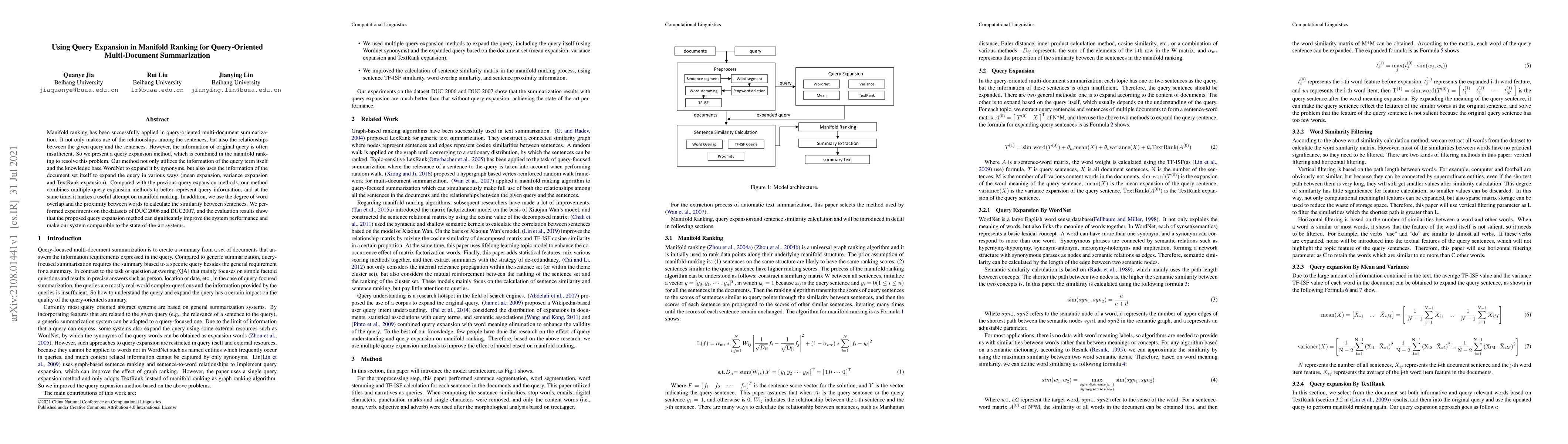 This paper proposes a query expansion method integrated with manifold ranking for query-oriented multi-document summarization, utilizing WordNet and document set information to enhance query representation. Experimental results on DUC datasets show significant performance improvements over previous methods.