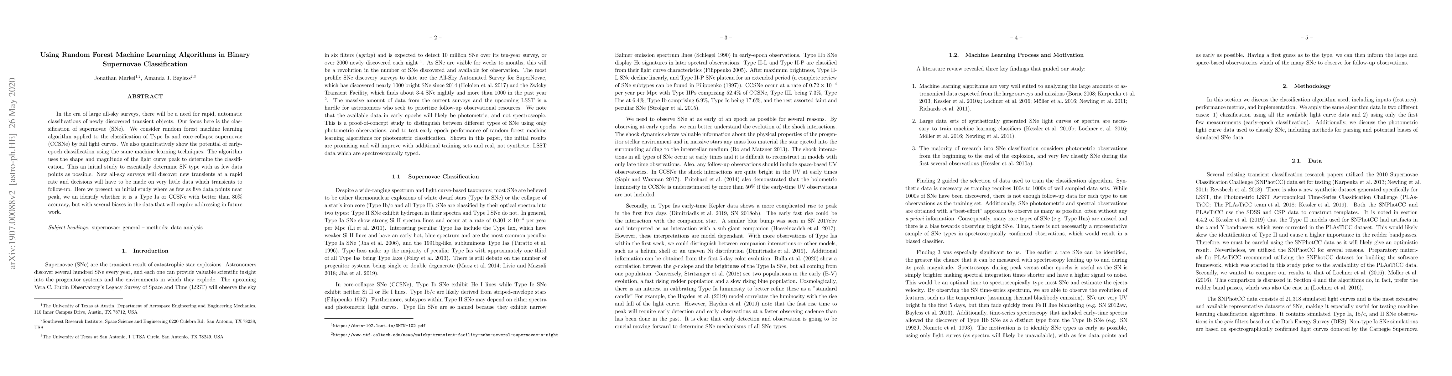 This study employs random forest machine learning algorithms to classify supernovae using their light curves, focusing on distinguishing Type Ia and core-collapse supernovae. The method achieves over 80% accuracy with as few as five data points near the peak, demonstrating the potential for rapid classification in large all-sky surveys.