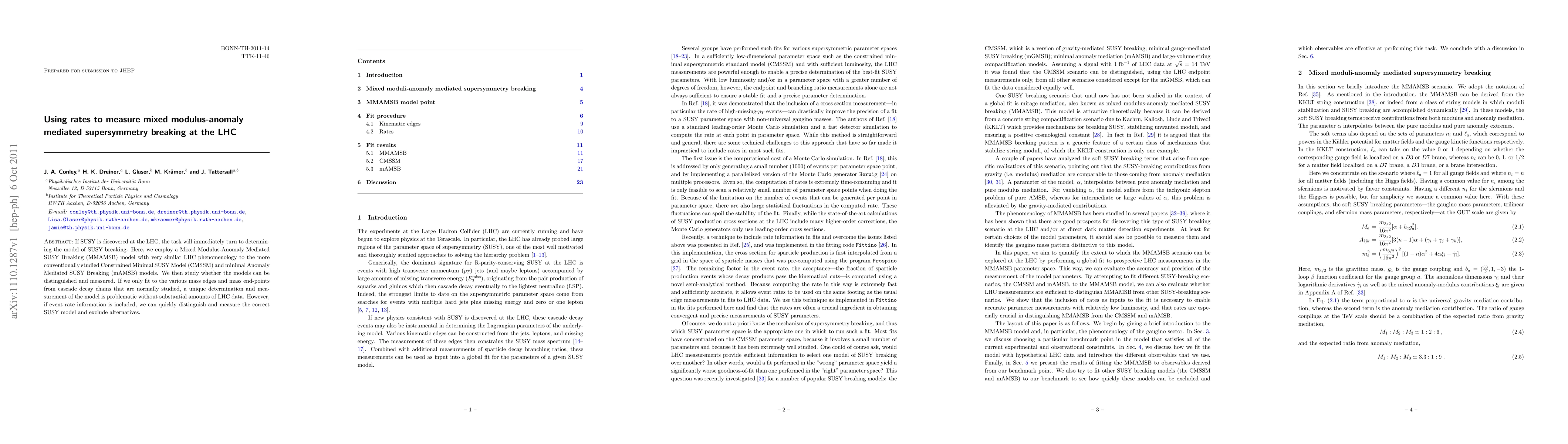 This paper investigates the Mixed Modulus-Anomaly Mediated SUSY Breaking (MMAMSB) model at the LHC, highlighting that distinguishing it from CMSSM and mAMSB models based on mass edges alone is difficult. The inclusion of event rate information allows for the precise identification and measurement of the MMAMSB model, thereby excluding other SUSY breaking alternatives.