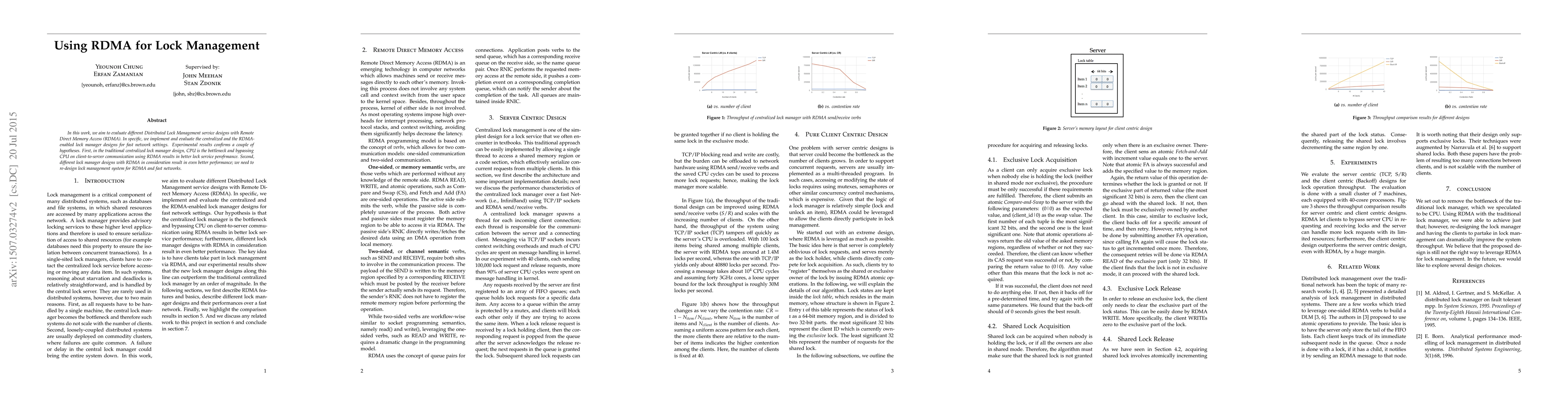 The paper presents an RDMA-enabled lock management design that bypasses CPU during client-server communication, leading to improved performance in both centralized and redesigned lock manager architectures.