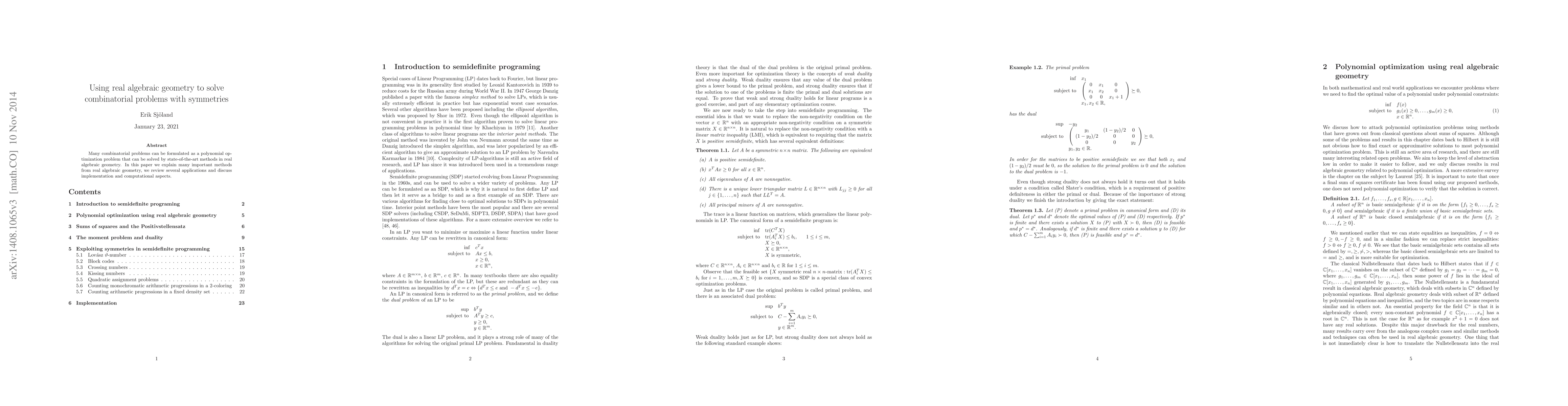 This paper explores the application of real algebraic geometry to solve combinatorial problems, particularly those involving symmetries, by formulating them as polynomial optimization problems. It discusses key methods, reviews various applications, and examines computational aspects and implementation challenges.