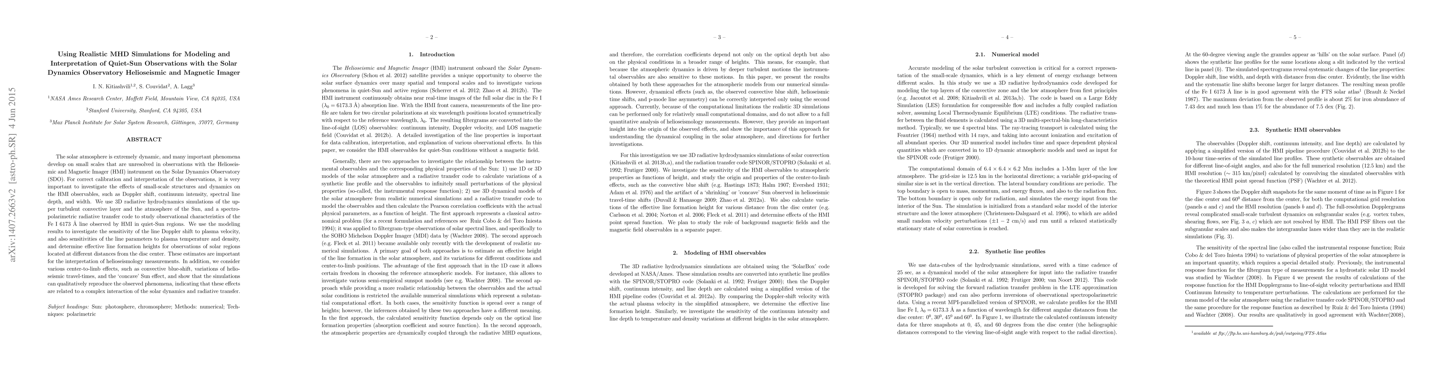 The solar atmosphere is extremely dynamic, and many important phenomena develop on small scales that are unresolved in observations with the Helioseismic and Magnetic Imager (HMI) instrument on the Solar Dynamics Observatory (SDO). For correct calibration and interpretation of the observations, it is very important to investigate the effects of small-scale structures and dynamics on the HMI observables, such as Doppler shift, continuum intensity, spectral line depth, and width. We use 3D radiative hydrodynamics simulations of the upper turbulent convective layer and the atmosphere of the Sun, and a spectro-polarimetric radiative transfer code to study observational characteristics of the Fe I 6173A line observed by HMI in quiet-Sun regions. We use the modeling results to investigate the sensitivity of the line Doppler shift to plasma velocity, and also sensitivities of the line parameters to plasma temperature and density, and determine effective line formation heights for observations of solar regions located at different distances from the disc center. These estimates are important for the interpretation of helioseismology measurements. In addition, we consider various center-to-limb effects, such as convective blue-shift, variations of helioseismic travel-times, and the 'concave' Sun effect, and show that the simulations can qualitatively reproduce the observed phenomena, indicating that these effects are related to a complex interaction of the solar dynamics and radiative transfer.