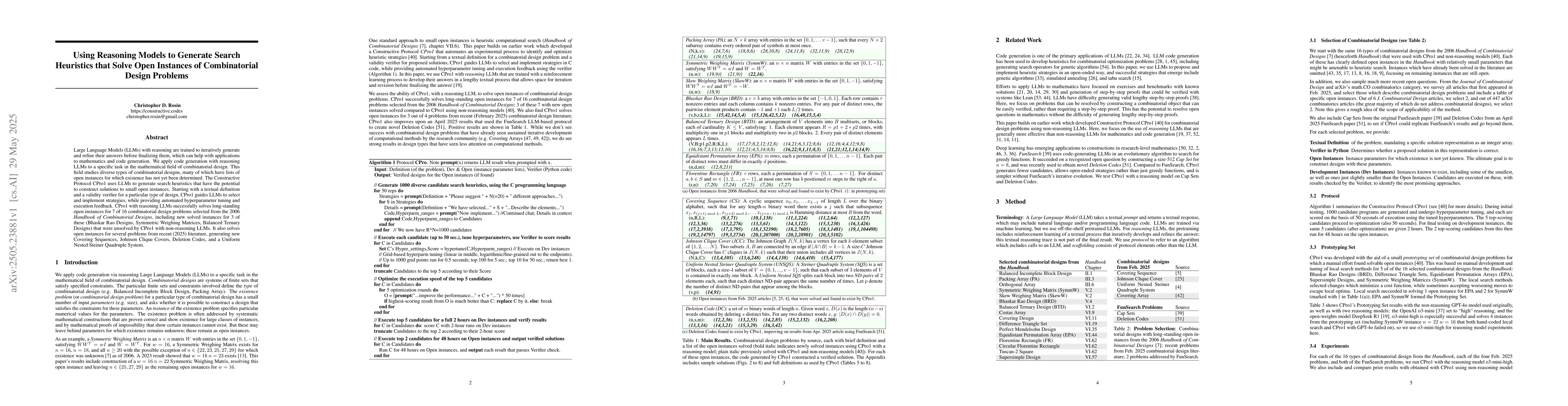 The introduction of CPro1 with reasoning LLMs for generating search heuristics to solve open combinatorial design instances, showcasing iterative refinement and automated tuning capabilities.