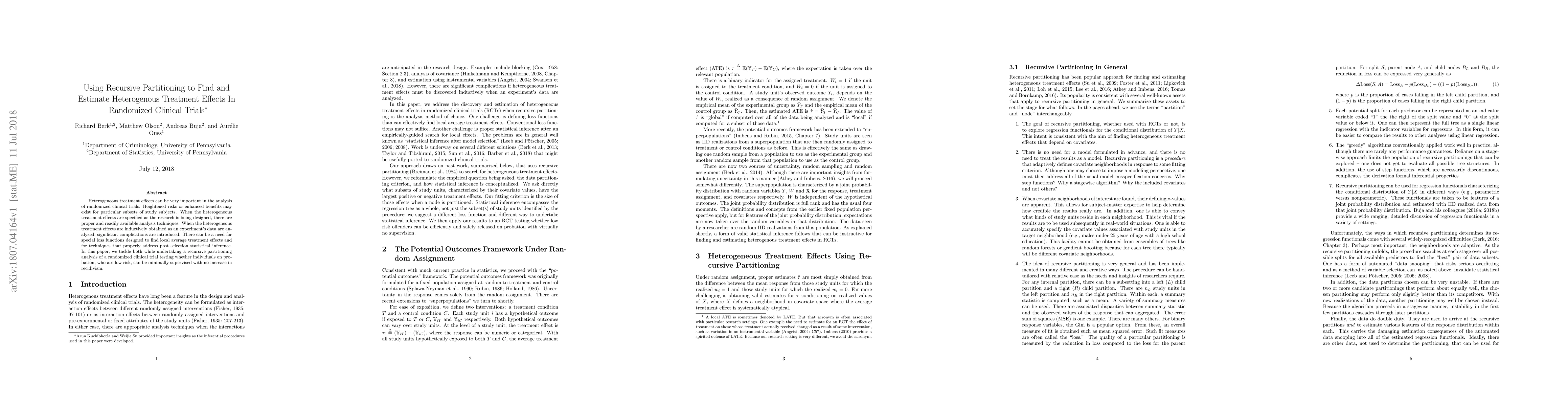This paper explores the use of recursive partitioning to identify and estimate heterogeneous treatment effects in randomized clinical trials, addressing the challenges of post-selection inference and the need for specialized loss functions when these effects are discovered during analysis. The study applies this method to a trial assessing whether low-risk probationers can be minimally supervised without increasing recidivism.