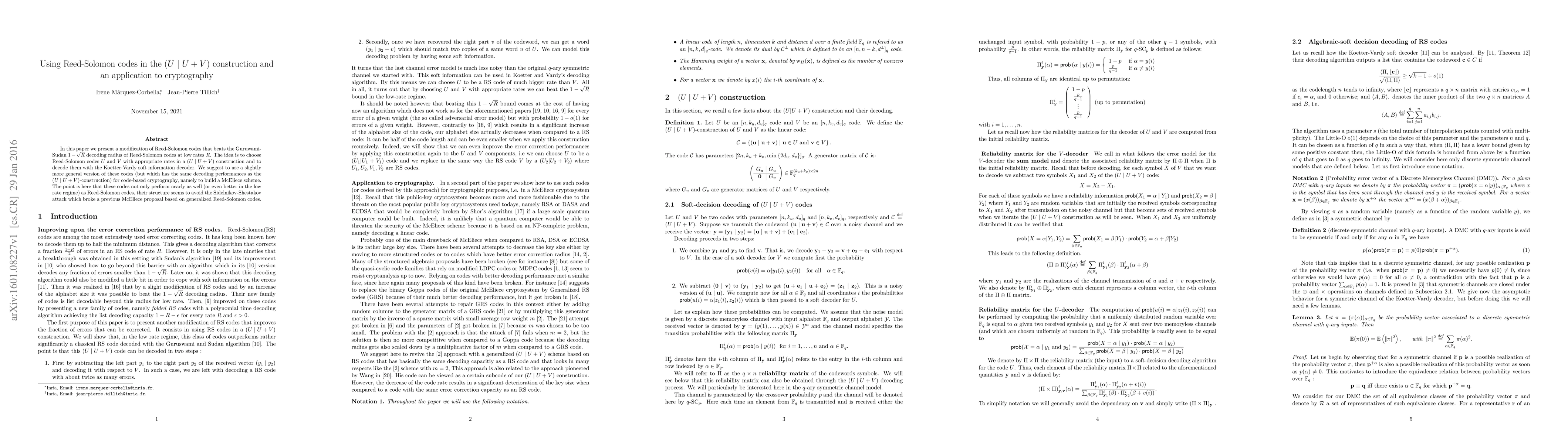 In this paper we present a modification of Reed-Solomon codes that beats the Guruwami-Sudan $1-\sqrt{R}$ decoding radius of Reed-Solomon codes at low rates $R$. The idea is to choose Reed-Solomon codes $U$ and $V$ with appropriate rates in a $\left( U\mid U+V\right)$ construction and to decode them with the Koetter-Vardy soft information decoder. We suggest to use a slightly more general version of these codes (but which has the same decoding performances as the $\left( U\mid U+V\right)$-construction) for code-based cryptography, namely to build a McEliece scheme. The point is here that these codes not only perform nearly as well (or even better in the low rate regime) as Reed-Solomon codes, their structure seems to avoid the Sidelnikov-Shestakov attack which broke a previous McEliece proposal based on generalized Reed-Solomon codes.