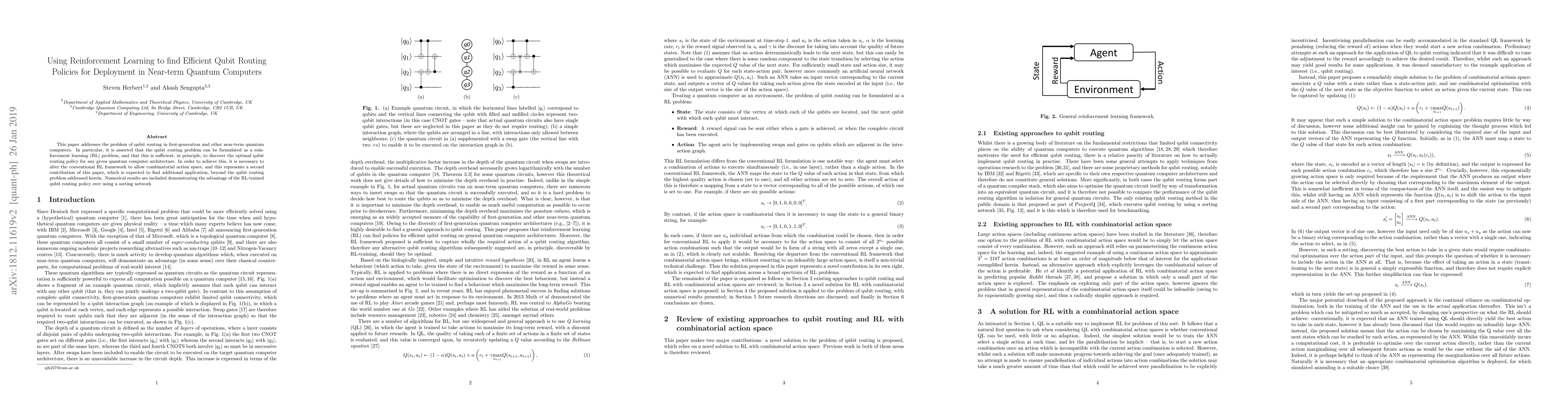 This paper addresses the problem of qubit routing in first-generation and other near-term quantum computers. In particular, it is asserted that the qubit routing problem can be formulated as a reinforcement learning (RL) problem, and that this is sufficient, in principle, to discover the optimal qubit routing policy for any given quantum computer architecture. In order to achieve this, it is necessary to alter the conventional RL framework to allow combinatorial action space, and this represents a second contribution of this paper, which is expected to find additional application, beyond the qubit routing problem addressed herein. Numerical results are included demonstrating the advantage of the RL-trained qubit routing policy over using a sorting network.