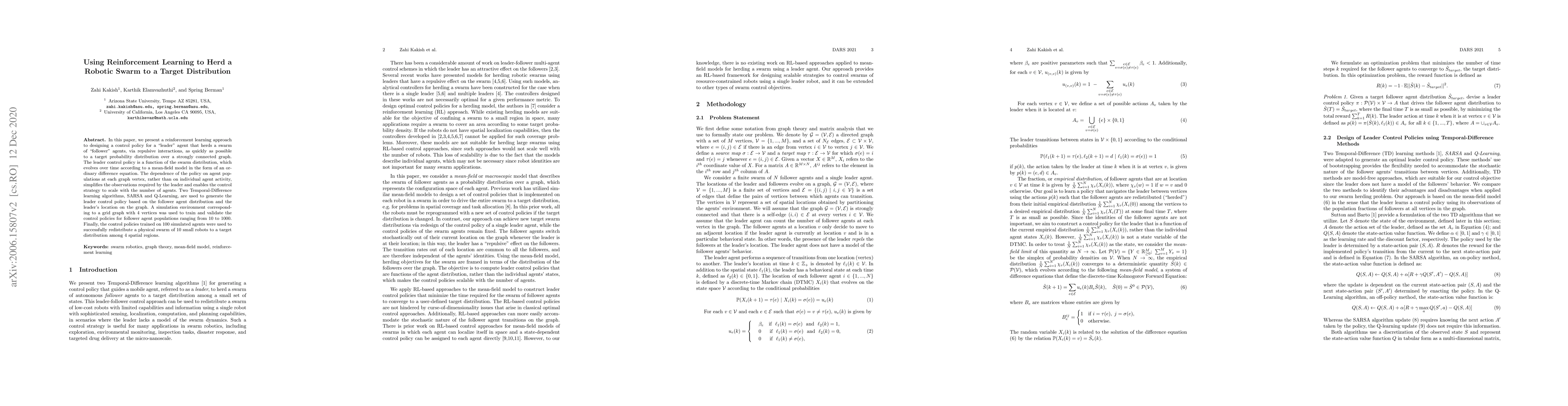 In this paper, we present a reinforcement learning approach to designing a control policy for a "leader" agent that herds a swarm of "follower" agents, via repulsive interactions, as quickly as possible to a target probability distribution over a strongly connected graph. The leader control policy is a function of the swarm distribution, which evolves over time according to a mean-field model in the form of an ordinary difference equation. The dependence of the policy on agent populations at each graph vertex, rather than on individual agent activity, simplifies the observations required by the leader and enables the control strategy to scale with the number of agents. Two Temporal-Difference learning algorithms, SARSA and Q-Learning, are used to generate the leader control policy based on the follower agent distribution and the leader's location on the graph. A simulation environment corresponding to a grid graph with 4 vertices was used to train and validate the control policies for follower agent populations ranging from 10 to 100. Finally, the control policies trained on 100 simulated agents were used to successfully redistribute a physical swarm of 10 small robots to a target distribution among 4 spatial regions.
