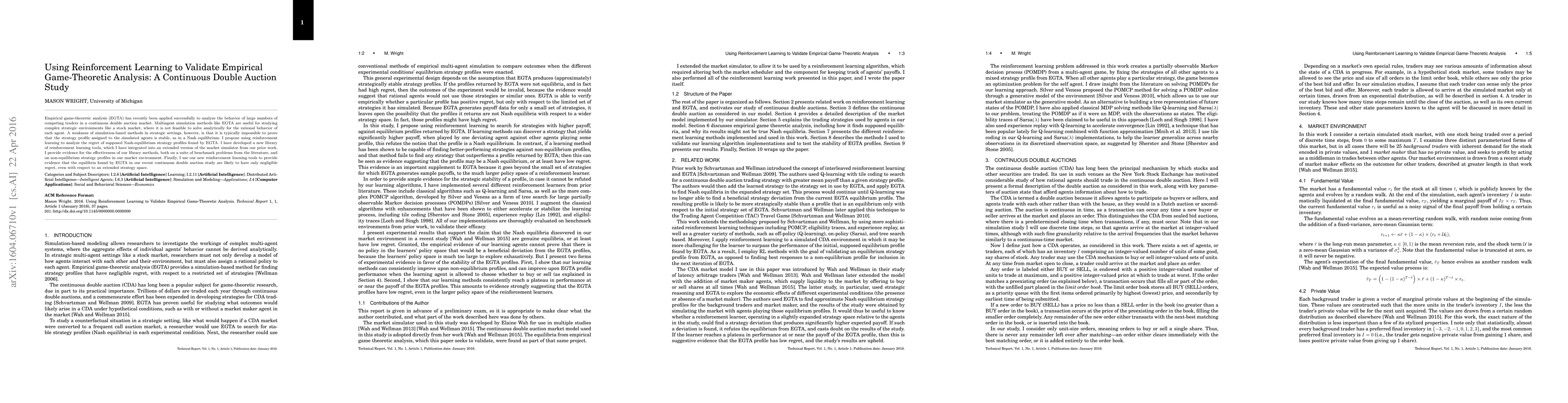 This paper proposes using reinforcement learning to validate empirical game-theoretic analysis (EGTA) in continuous double auctions by assessing the stability of Nash equilibria. The author integrates a new reinforcement learning library into an extended market simulator to evaluate the regret of EGTA-derived strategies, providing evidence that these equilibria exhibit negligible regret.