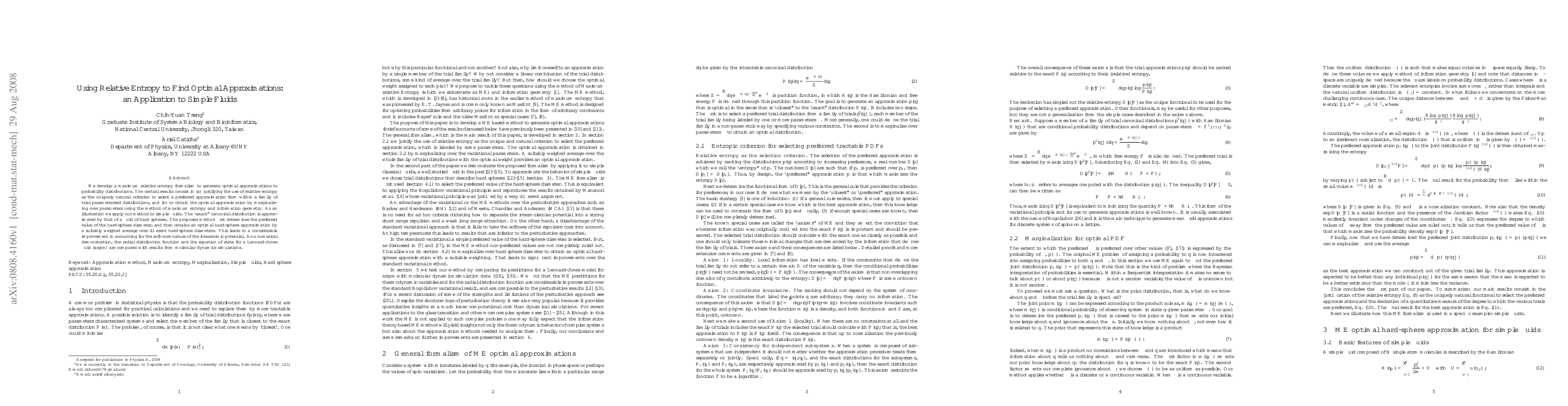 We develop a maximum relative entropy formalism to generate optimal approximations to probability distributions. The central results consist in (a) justifying the use of relative entropy as the uniquely natural criterion to select a preferred approximation from within a family of trial parameterized distributions, and (b) to obtain the optimal approximation by marginalizing over parameters using the method of maximum entropy and information geometry. As an illustration we apply our method to simple fluids. The "exact" canonical distribution is approximated by that of a fluid of hard spheres. The proposed method first determines the preferred value of the hard-sphere diameter, and then obtains an optimal hard-sphere approximation by a suitably weighed average over different hard-sphere diameters. This leads to a considerable improvement in accounting for the soft-core nature of the interatomic potential. As a numerical demonstration, the radial distribution function and the equation of state for a Lennard-Jones fluid (argon) are compared with results from molecular dynamics simulations.