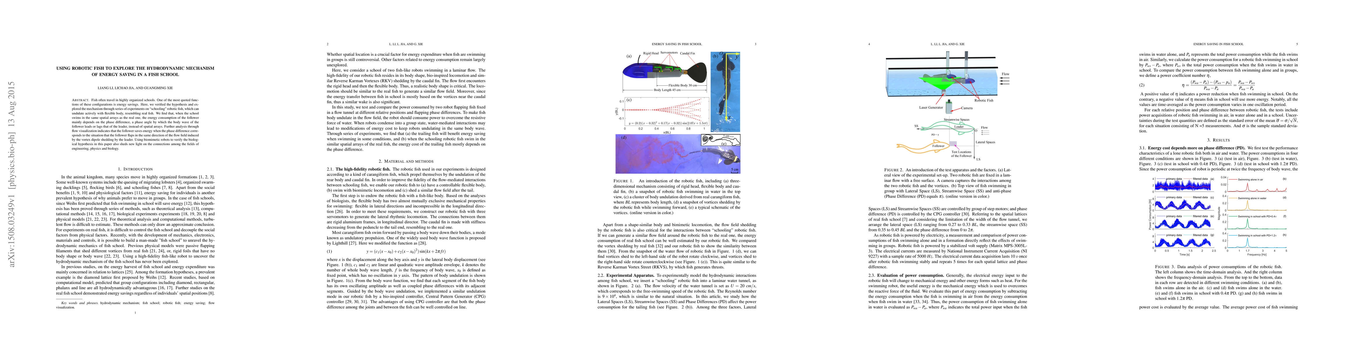 This study uses robotic fish to investigate the hydrodynamic mechanism of energy savings in fish schools, finding that follower fish primarily save energy based on the phase difference in body wave motion relative to the leader, rather than spatial arrangement. The research highlights the interdisciplinary connections between engineering, physics, and biology.