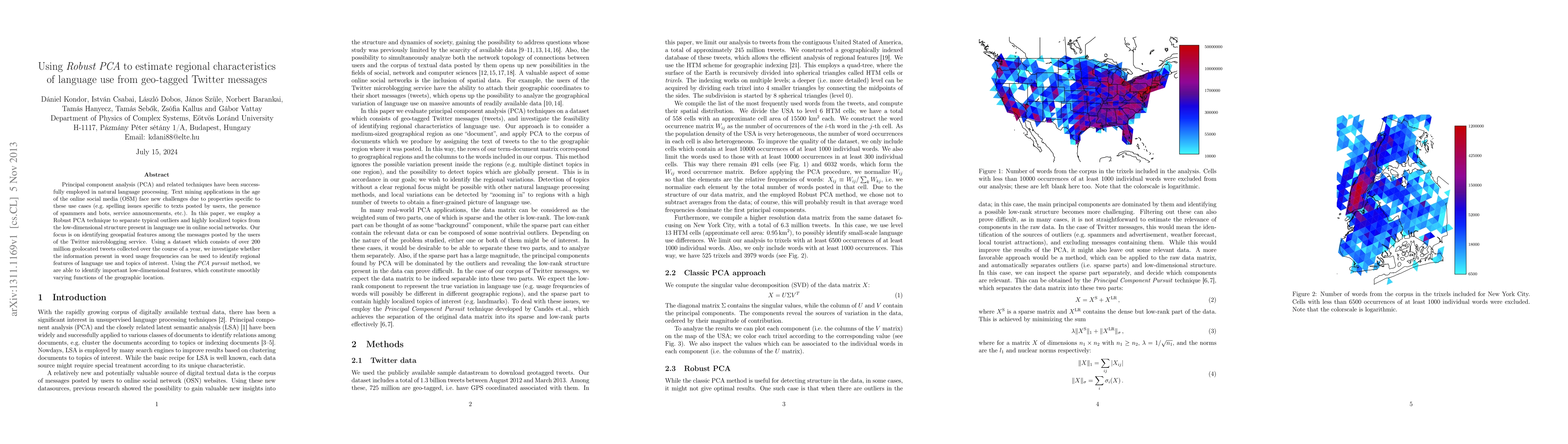 This paper uses Robust PCA to analyze over 200 million geotagged Twitter messages to identify regional characteristics in language use, separating outliers and localized topics from the general language structure. The study reveals how word usage frequencies can highlight geospatial features and topics of interest in Twitter data.