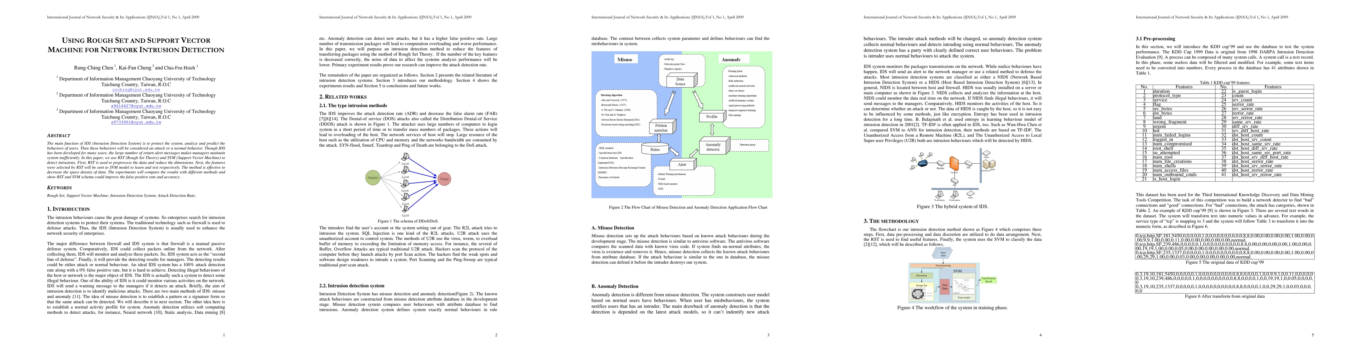 The main function of IDS (Intrusion Detection System) is to protect the system, analyze and predict the behaviors of users. Then these behaviors will be considered an attack or a normal behavior. Though IDS has been developed for many years, the large number of return alert messages makes managers maintain system inefficiently. In this paper, we use RST (Rough Set Theory) and SVM (Support Vector Machine) to detect intrusions. First, RST is used to preprocess the data and reduce the dimensions. Next, the features were selected by RST will be sent to SVM model to learn and test respectively. The method is effective to decrease the space density of data. The experiments will compare the results with different methods and show RST and SVM schema could improve the false positive rate and accuracy.