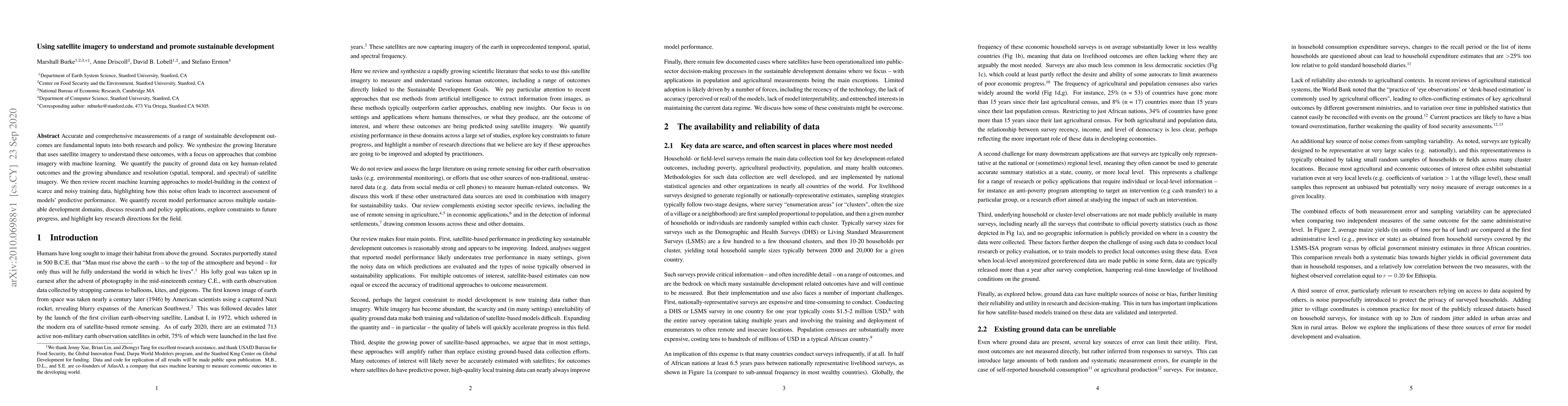This paper synthesizes literature on using satellite imagery and machine learning to measure sustainable development outcomes, highlighting the growing resolution of satellite data and the challenges in model performance due to noisy training data. It discusses applications, constraints, and future research directions in the field.