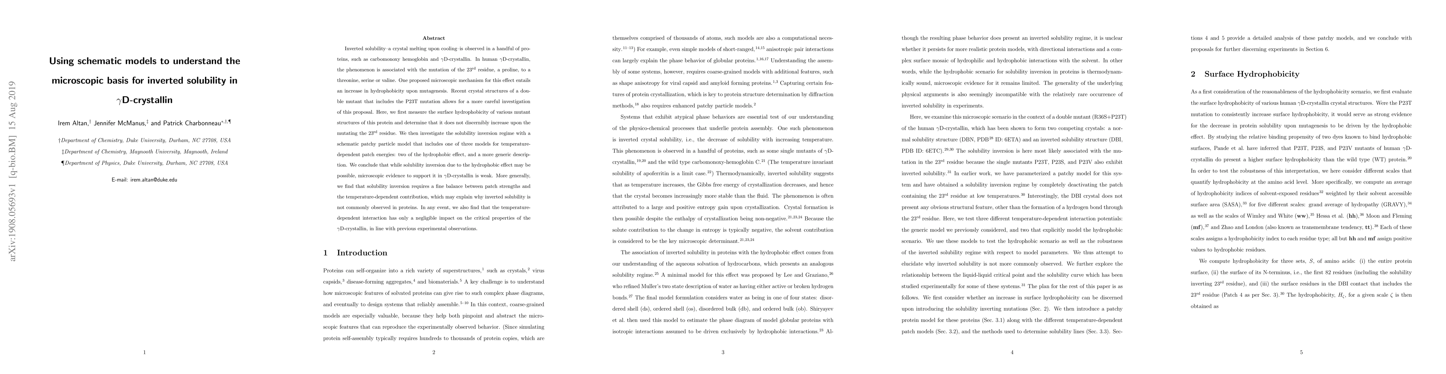 Inverted solubility--a crystal melting upon cooling--is observed in a handful of proteins, such as carbomonoxy hemoglobin and $\gamma$D-crystallin. In human $\gamma$D-crystallin, the phenomenon is associated with the mutation of the 23$^\mathrm{rd}$ residue, a proline, to a threonine, serine or valine. One proposed microscopic mechanism for this effect entails an increase in hydrophobicity upon mutagenesis. Recent crystal structures of a double mutant that includes the P23T mutation allows for a more careful investigation of this proposal. Here, we first measure the surface hydrophobicity of various mutant structures of this protein and determine that it does not discernibly increase upon the mutating the 23$^\mathrm{rd}$ residue. We then investigate the solubility inversion regime with a schematic patchy particle model that includes one of three models for temperature-dependent patch energies: two of the hydrophobic effect, and a more generic description. We conclude that while solubility inversion due to the hydrophobic effect may be possible, microscopic evidence to support it in $\gamma$D-crystallin is weak. More generally, we find that solubility inversion requires a fine balance between patch strengths and the temperature-dependent contribution, which may explain why inverted solubility is not commonly observed in proteins. In any event, we also find that the temperature-dependent interaction has only a negligible impact on the critical properties of the $\gamma$D-crystallin, in line with previous experimental observations.