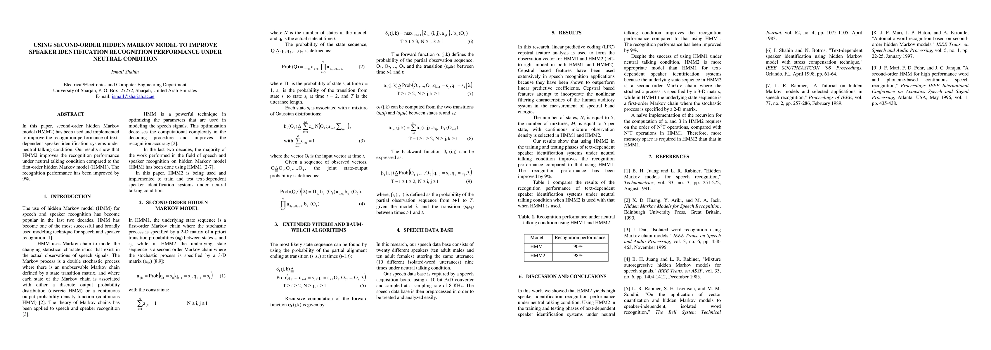 This paper utilizes a second-order hidden Markov model (HMM2) to enhance text-dependent speaker identification performance under neutral talking conditions, achieving a 9% improvement over the first-order hidden Markov model (HMM1).