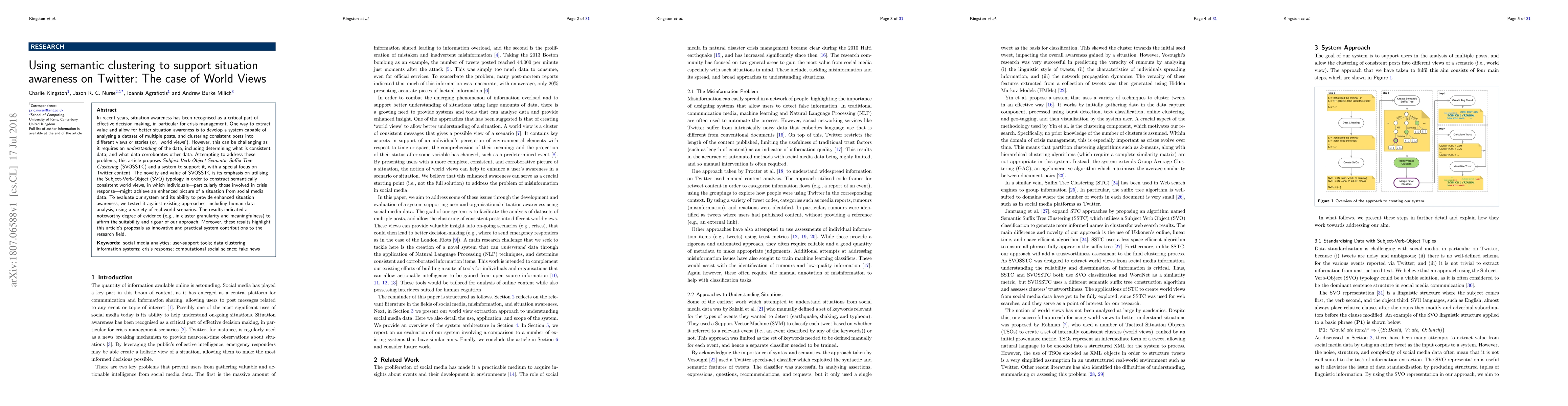 This paper proposes a novel Subject-Verb-Object Semantic Suffix Tree Clustering (SVOSSTC) method to enhance situation awareness on Twitter by clustering semantically consistent posts into different views. The evaluation against existing methods and human analysis shows promising results, indicating the approach's effectiveness and potential for crisis response.