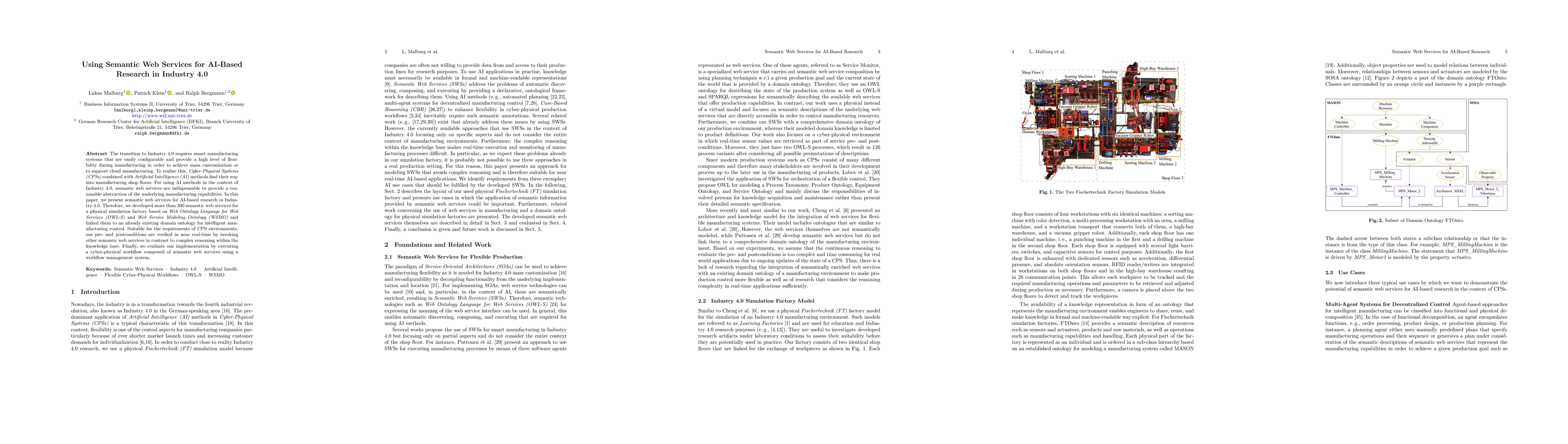 The transition to Industry 4.0 requires smart manufacturing systems that are easily configurable and provide a high level of flexibility during manufacturing in order to achieve mass customization or to support cloud manufacturing. To realize this, Cyber-Physical Systems (CPSs) combined with Artificial Intelligence (AI) methods find their way into manufacturing shop floors. For using AI methods in the context of Industry 4.0, semantic web services are indispensable to provide a reasonable abstraction of the underlying manufacturing capabilities. In this paper, we present semantic web services for AI-based research in Industry 4.0. Therefore, we developed more than 300 semantic web services for a physical simulation factory based on Web Ontology Language for Web Services (OWL-S) and Web Service Modeling Ontology (WSMO) and linked them to an already existing domain ontology for intelligent manufacturing control. Suitable for the requirements of CPS environments, our pre- and postconditions are verified in near real-time by invoking other semantic web services in contrast to complex reasoning within the knowledge base. Finally, we evaluate our implementation by executing a cyber-physical workflow composed of semantic web services using a workflow management system.