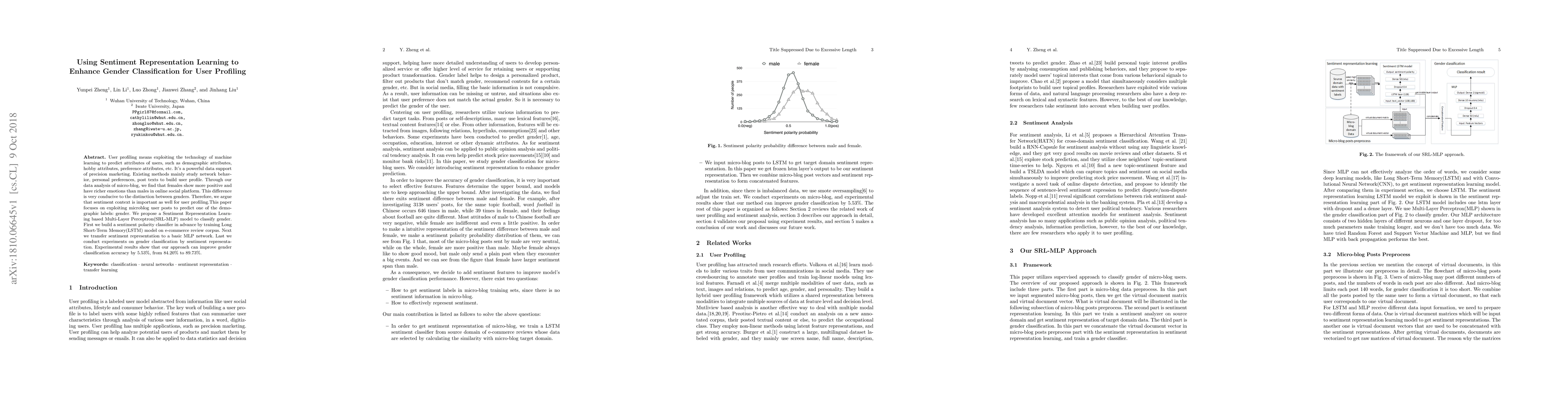 This paper proposes a Sentiment Representation Learning based Multi-Layer Perceptron (SRL-MLP) model to enhance gender classification in user profiling using microblog posts. The model improves gender classification accuracy by 5.53%, from 84.20% to 89.73%, by leveraging sentiment context derived from microblog data.