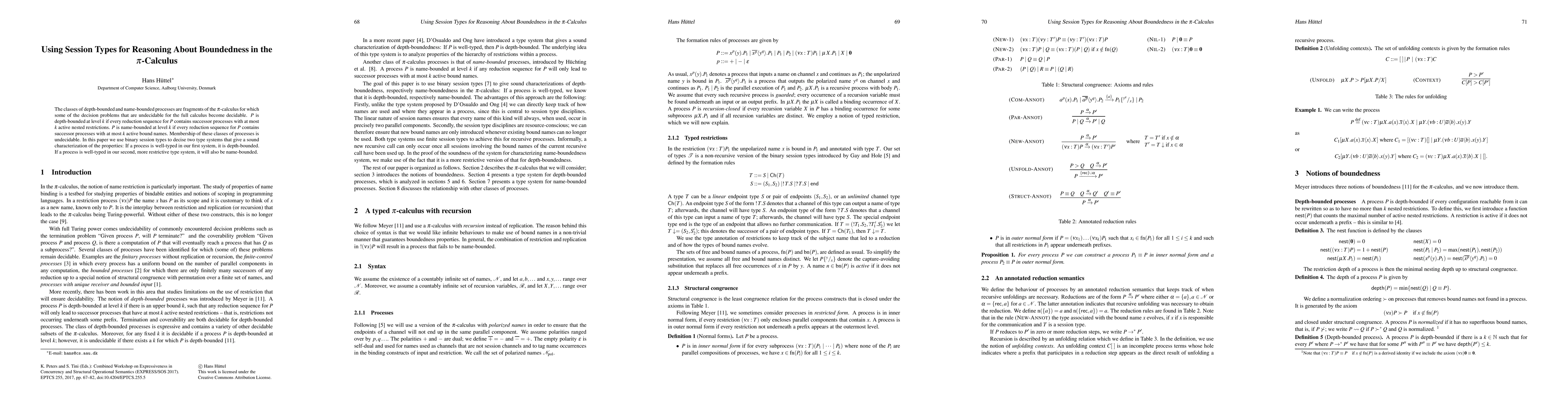 Researchers used binary session types to prove that processes with certain structural properties can be classified as either depth-bounded or name-bounded in the pi-calculus, resolving undecidable membership problems.